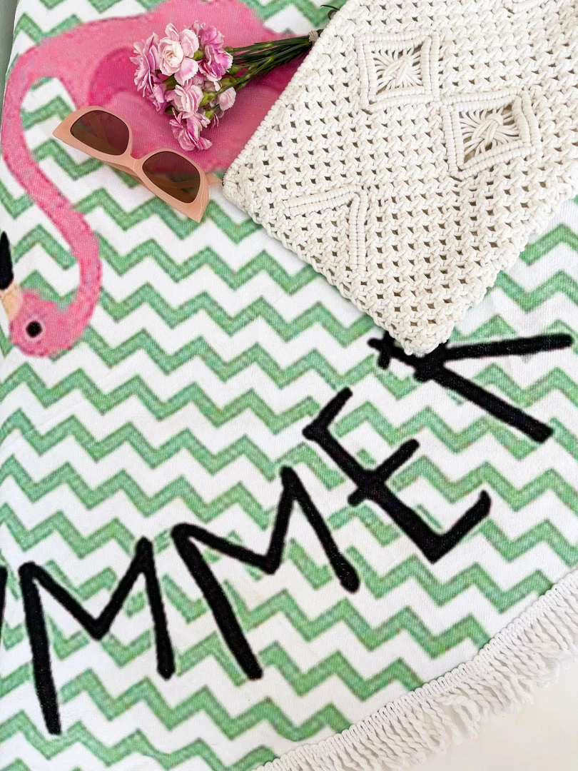 Our Flamingo Towel comes in an aqua tone, with a pink & black tone print. This towel is the ultimate summer accessory, ideal for basking in the sun, enjoying picnics & tanning at the pool!