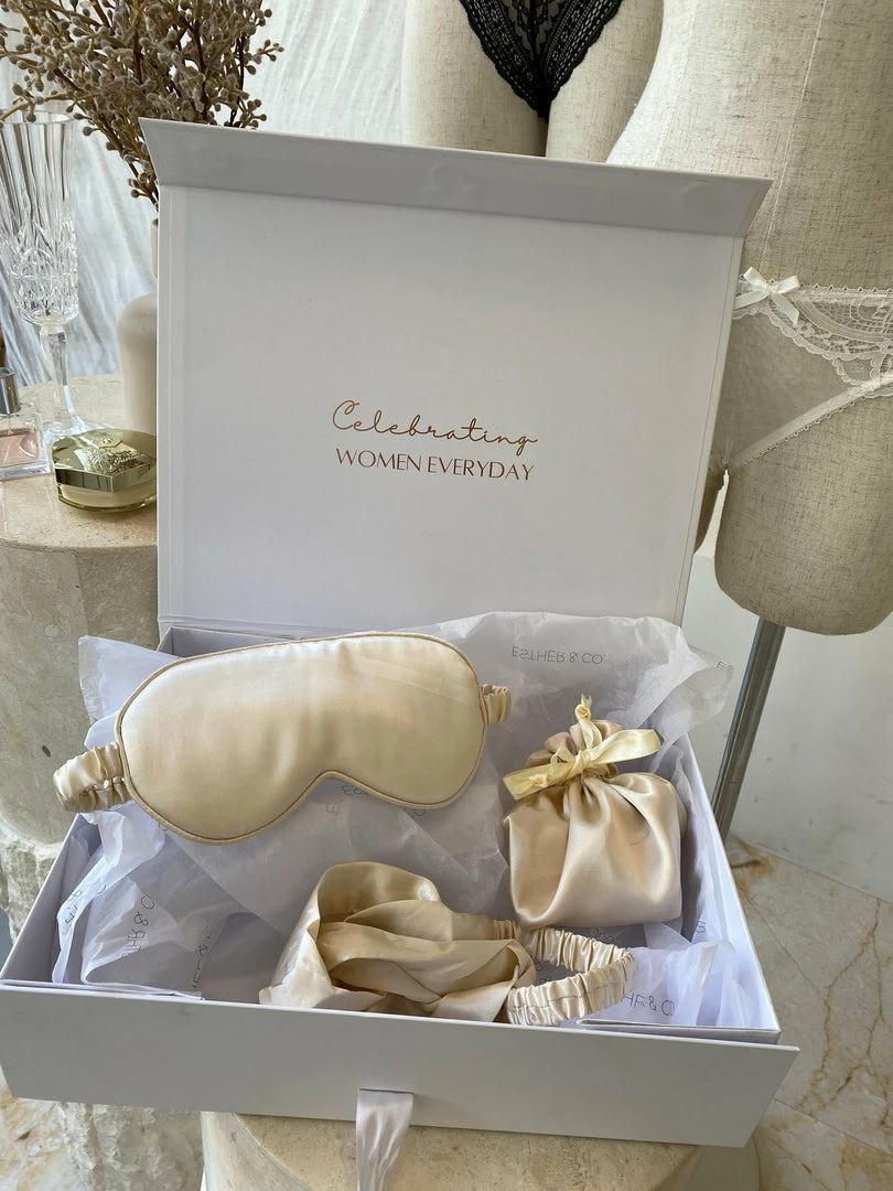 Our Satin Eye Mask Pack in Champagne is the perfect accessory to up your sleep game. Included in this gorgeous pack in a satin eye mask, headband, and bag. These eye masks are perfect for sleeping in!