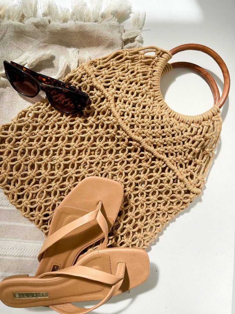 This features a wooden round handle and the bag itself is made from a beautiful cotton cord. Your beach outfit will not be complete without our Tossy bag!