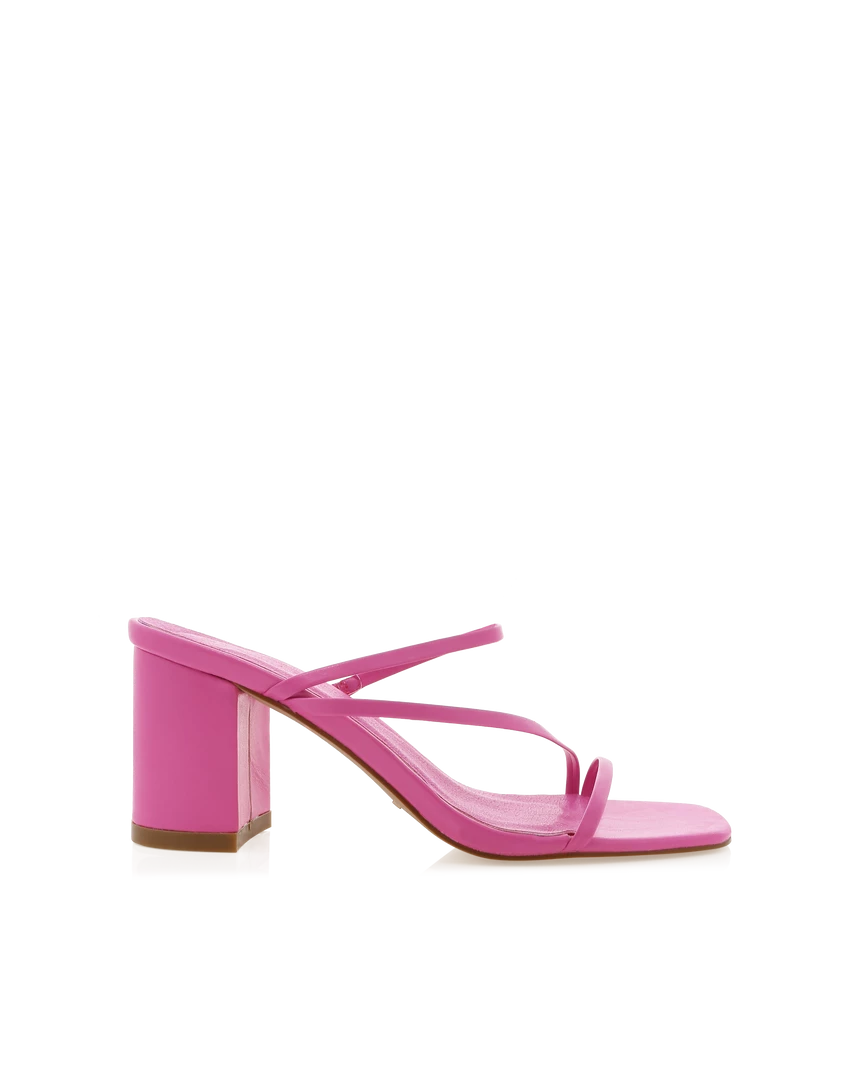 - Key Features: Mid block heel. Open square toe. Fine flat cross over strap upper vamp. Open heel counter. Slip on design.