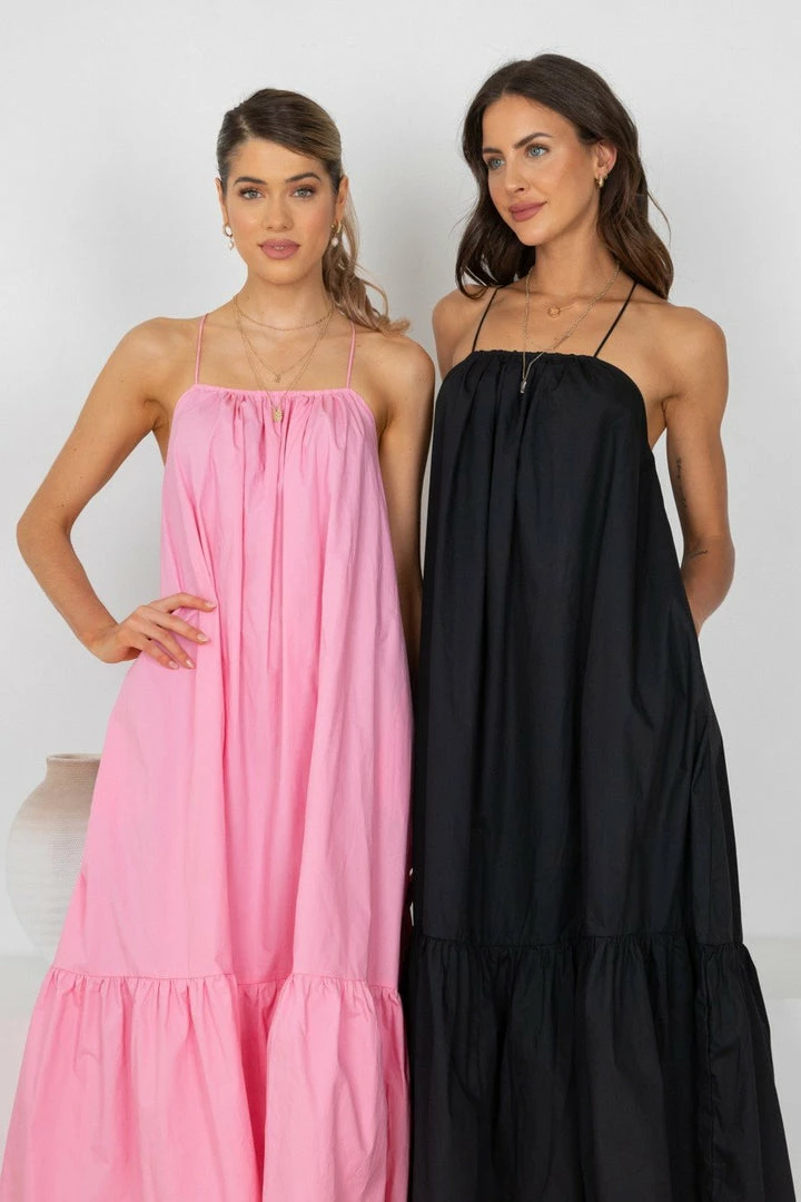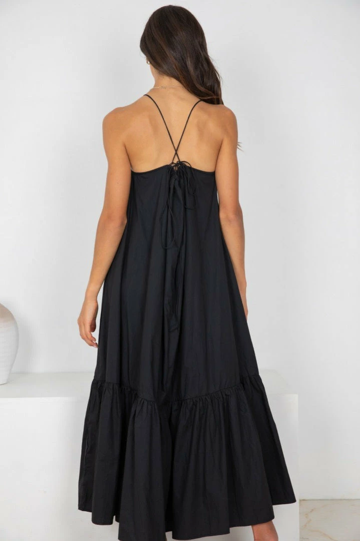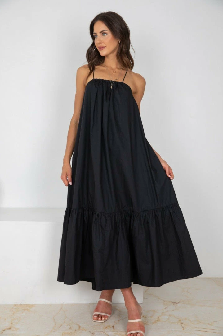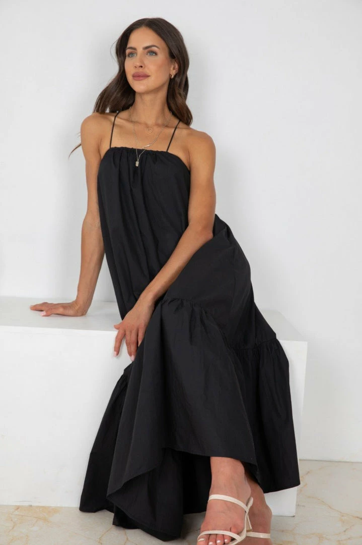 Our Letizia Dress comes in a classic black tone. This relaxed fit maxi is made from a layered flowy cotton material that is sure to make this a dreamy addition to your wardrobe. Pair with strappy flats for the perfect trans-seasonal look!