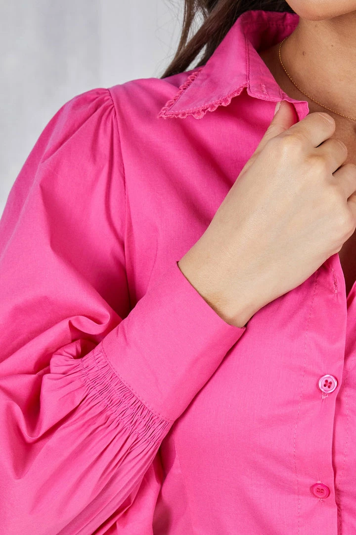 Our Melainey Blouse comes in a cotton candy pink colour. Business with a bit of fun, this top is a stylish deconstructed take on the classic shirt. It features a collar piped with a lace embellishment, functional button closure, long balloon cuffed sleeves and can be beautifully paired with a leather skirt and butterfly sunglasses!