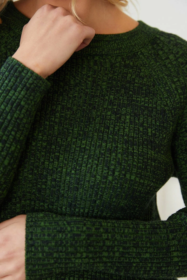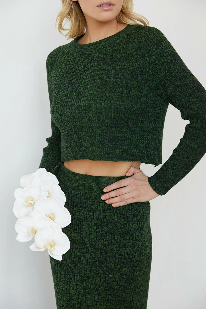 Our Margo Top comes in a moss green tone. It features a round neckline, long fitted sleeves and ribbed knit detailing all over the garment. Pair with our gorgeous Margo Skirt for a luxurious matching outfit!