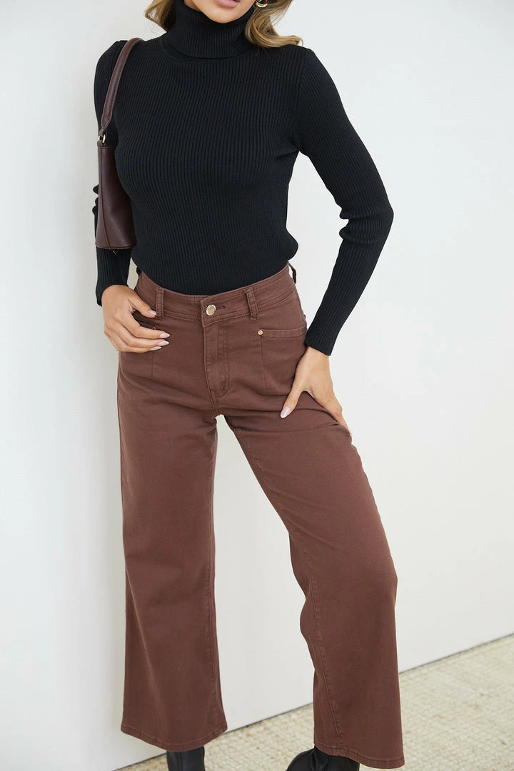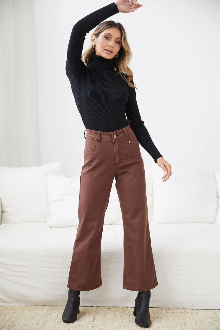 Our Aquilla Jeans come in a wood brown colour. Creating a subtle yet adorable statement to your casual wear, these pants are designed with a wide-leg fit, belt loops, button & zip closure and side pockets. Embellish it with a leather belt and gold rings!