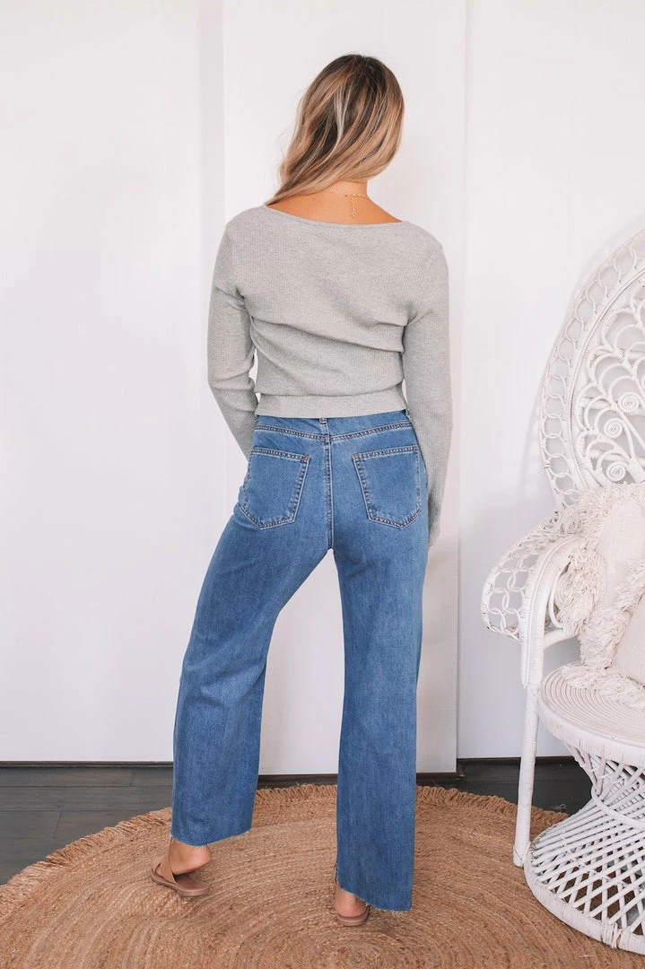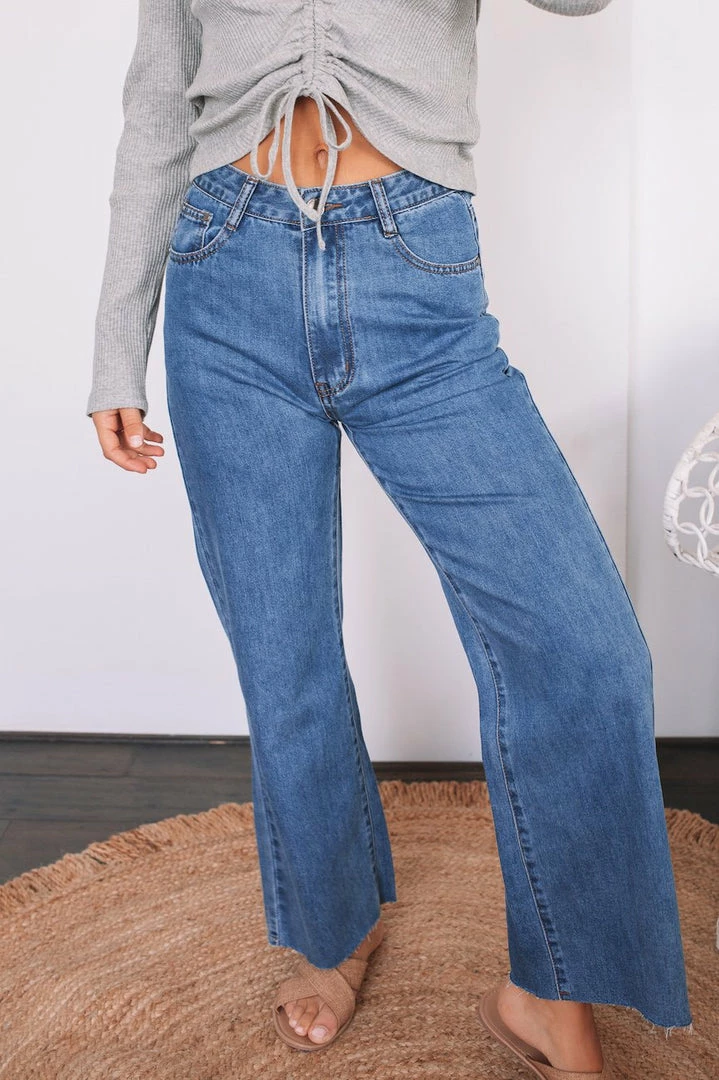 Our beautiful and comfy Gigi Jeans now comes in a stunning mid blue tone. The high waist, medium weight non-stretch fabric, with a while leg fit is a classic model that will give a gorgeous line to your shape. With pockets on the front side and back, it is a must-have for any wardrobe as easily matches with so many styles.