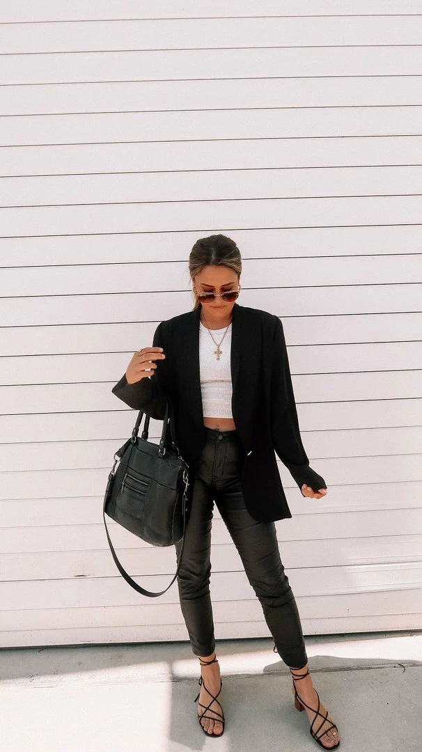 Our Spade Pants are a black tone in a wetlook style. They feature pockets on the front sides and back, belt loops along the waistband, and a hidden zipper on the front with black button to hold. These high-waisted pants are perfectly paired with a tucked in, oversized tee and white sneakers!