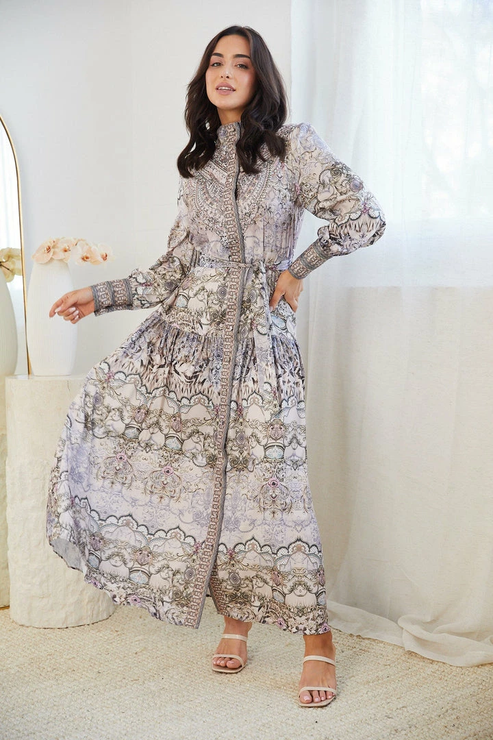 Our Alva Dress comes in a beige tone base with multicoloured print and beautiful gem detail. It features a high neckline, long bishop sleeves and a fabric waist tie to cinch in the figure beautifully. This maxi pairs beautifully with heels for a stunning casual look!