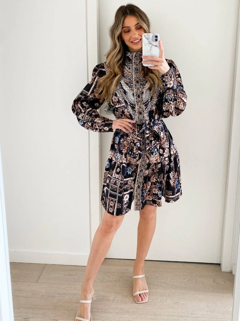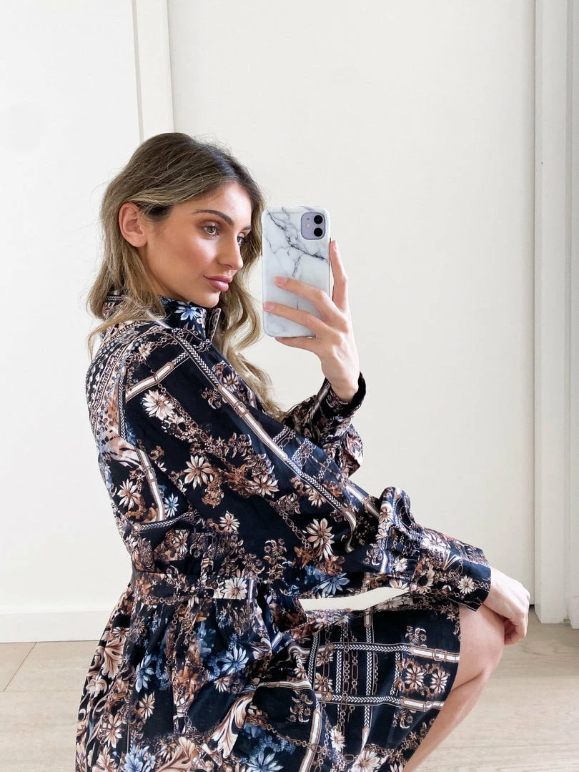 Our Amalee Dress comes in a black tone base, with blush, beige & light blue tone print. It features a high neckline, long bishop sleeves and buttons down the front to close. This midi pairs beautifully with heels for a stunning casual look!