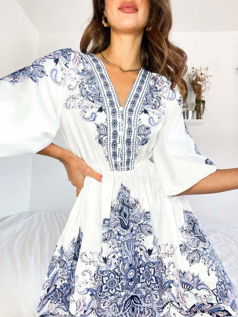 Our Kayleigh Dress comes in a white tone base, with a blue & blush tone print. It features a v neckline, short sleeves, button detailing down the front, and a fabric belt to cinch in the figure beautifully. This flowy midi pairs beautifully with heels for an elegant seasonal look!