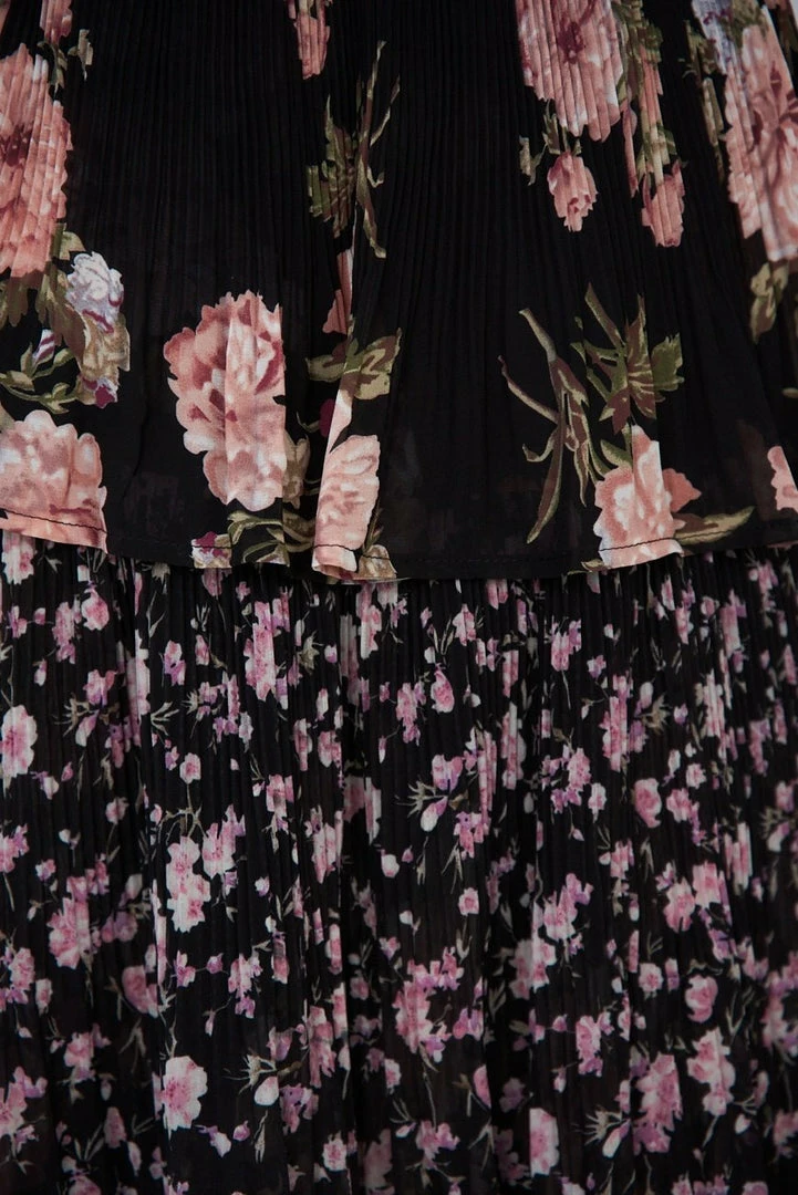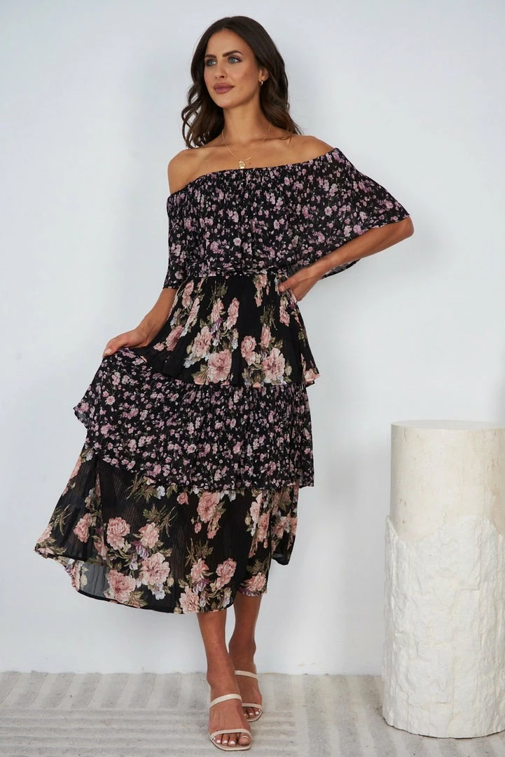 Our Kerstin Dress comes in a black tone base, with a pink tone floral print. It features an off-the-shoulder neckline, short sleeves, and a layered skirt. This flowy midi pairs beautifully with heels for a stunning lookj this spring season!