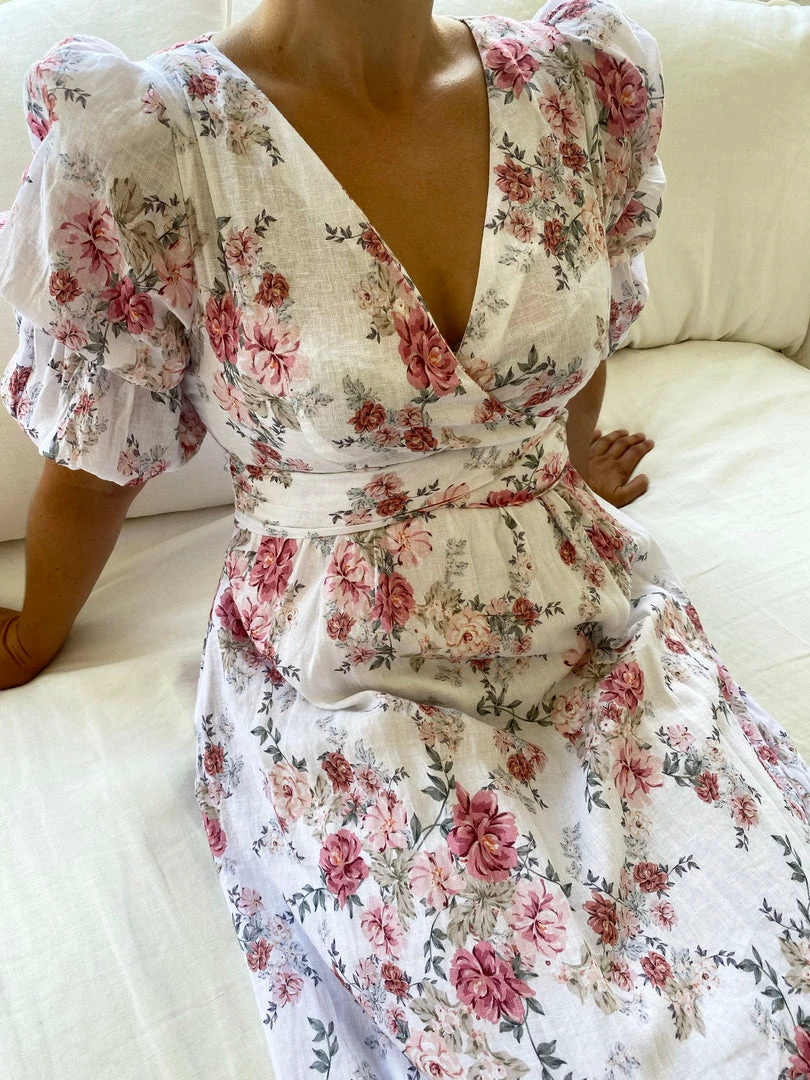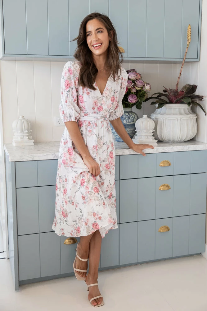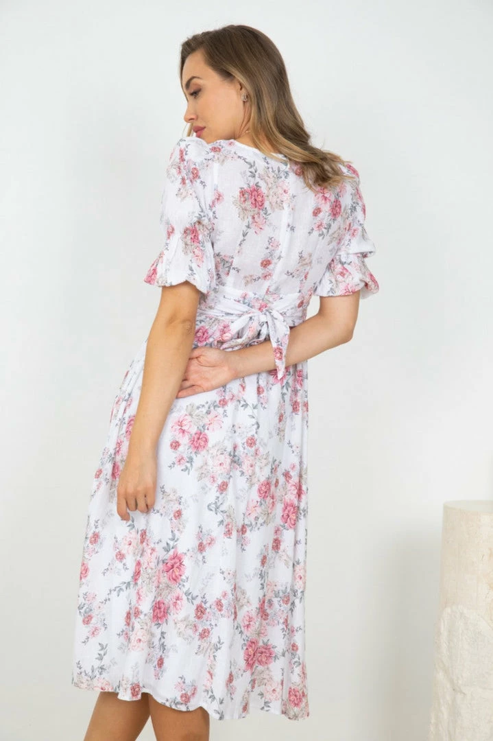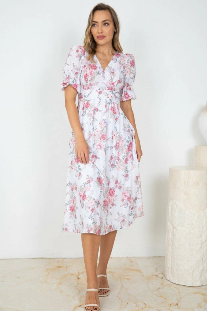 Our Lyrica Dress comes in a white tone base, with a pink tone floral print. It features a v neckline, short sleeves, and a fabric waist tie to cinch in the figure beautifully. This flowy midi is a wonderful addition to your spring wardrobe!