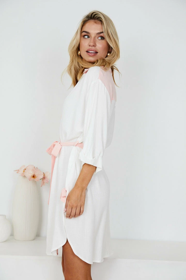 - Key Features: Mini Length. V neckline. Long sleeves. Collars. Relaxed fit. Fabric belt. Belt holes. Maternity friendly.