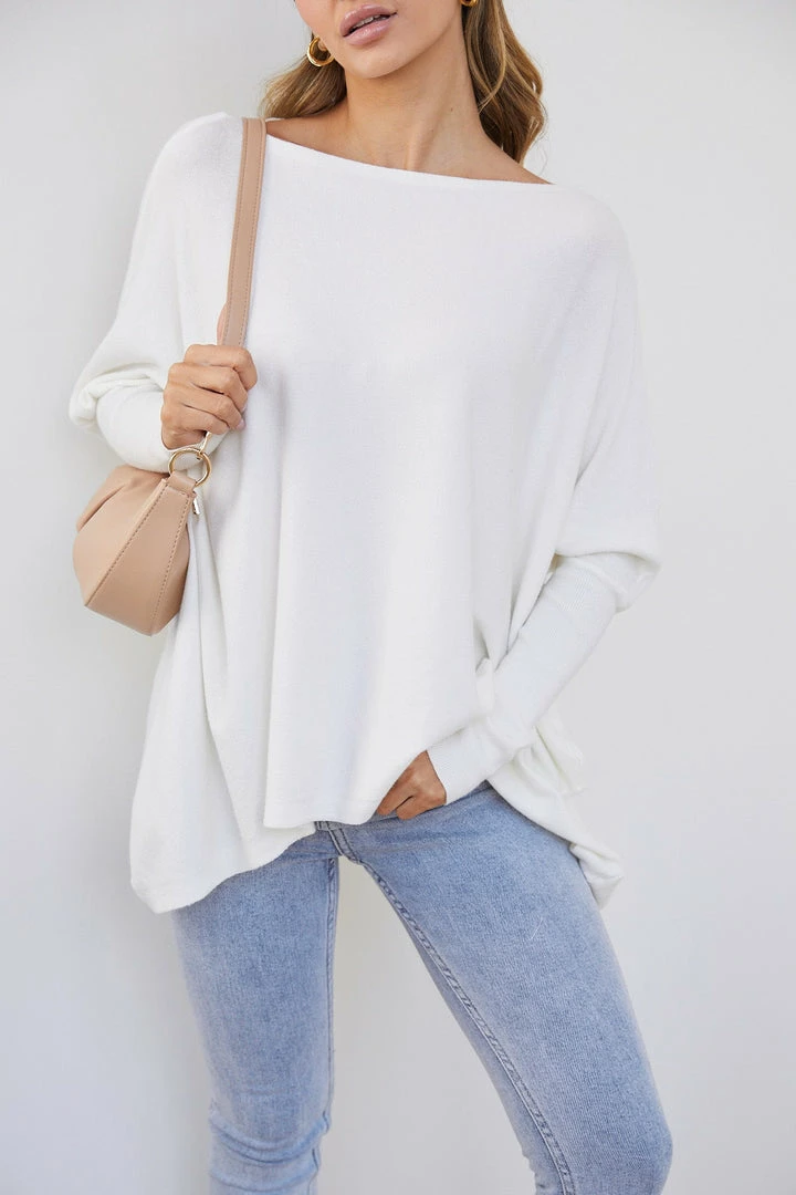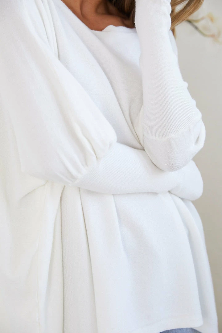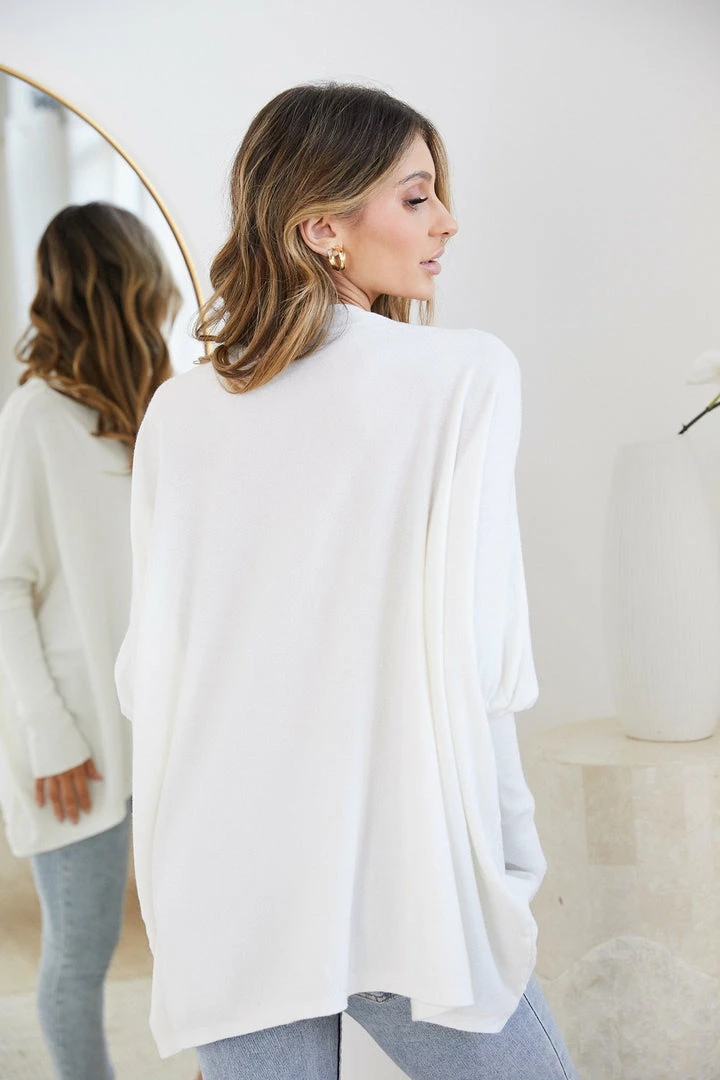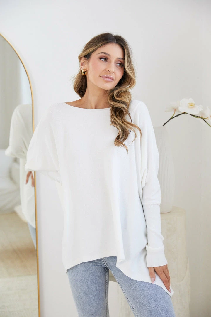 Our Clia Knit comes in a milky white colour in an oversized drape fit. This features a boat neckline, batwing long fitted sleeves, and a roomy fit making this ideal for growing baby bumps. This piece is made from lightweight breathable material which is perfect for a trans-seasonal outfit.