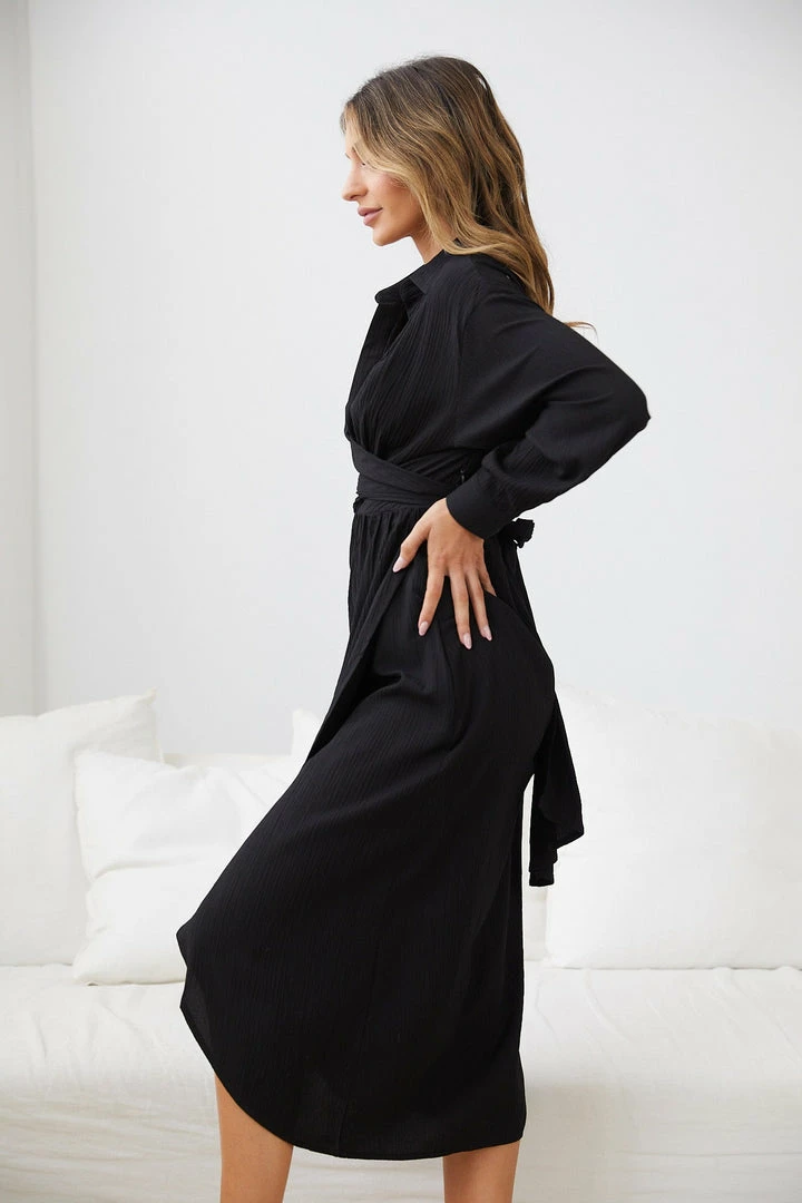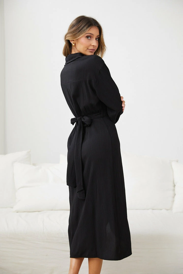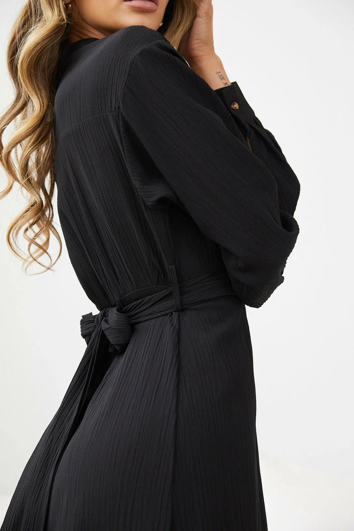 Our Daniyah Dress comes in a rich black colour. Showing you the way to the style celebration, this midi is designed with a classic collar, top front buttons, long sleeves with cuffs and overlap details on the waist and skirt. Elevate your look by matching this with a striking shade strappy open toe heels!