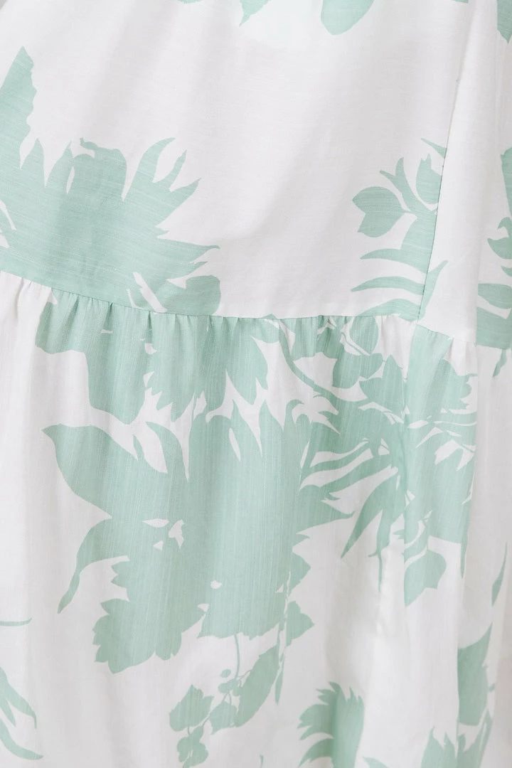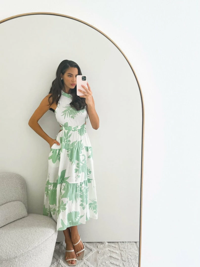 Our Froella Dress is a gorgeous halter neck style maxi that comes in a classic white base with green tone floral prints. The frill hemline & fabric waist tie cinches the figure beautifully & is a lovely feminine addition to the wardrobe.