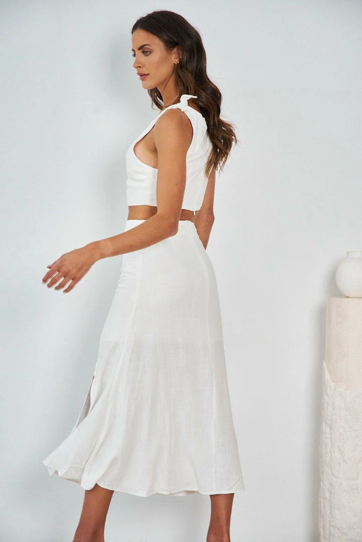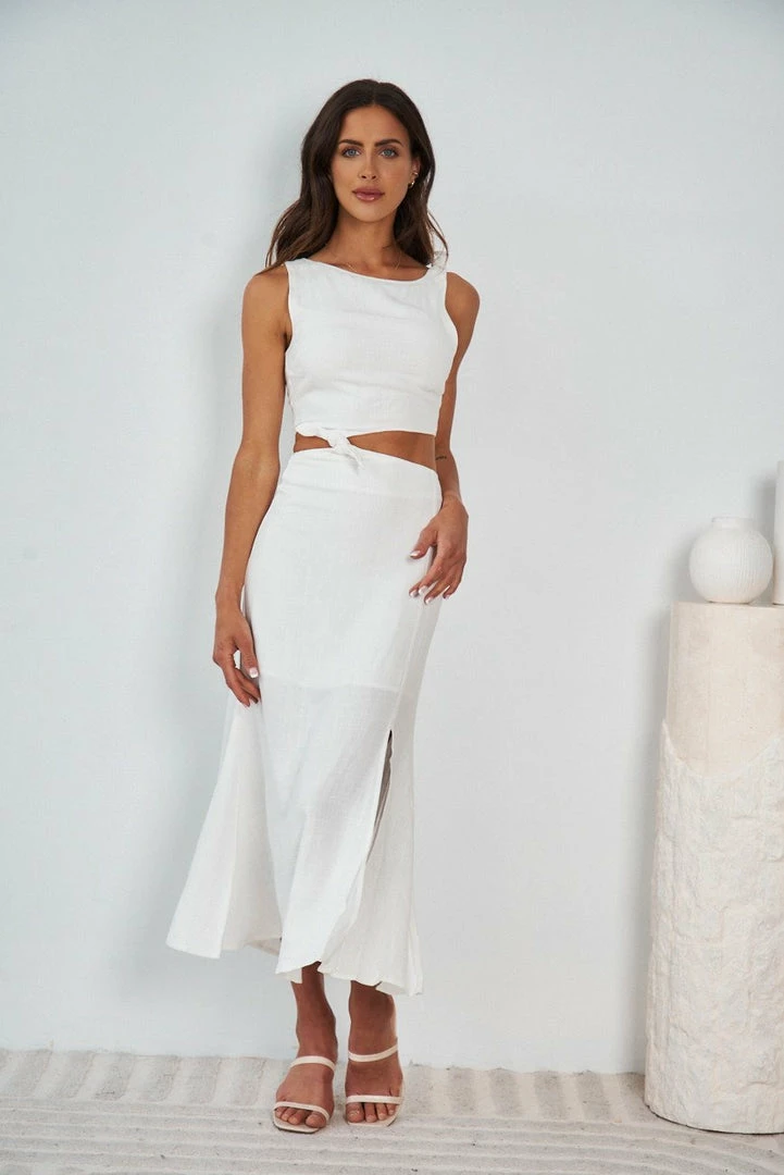 Our Izzy Dress comes in fresh white tone. It’s a sleeveless midi that features a boat neckline and a cutout at the waist. This flowy midi pairs beautifully with heels for a stunning look this spring season!