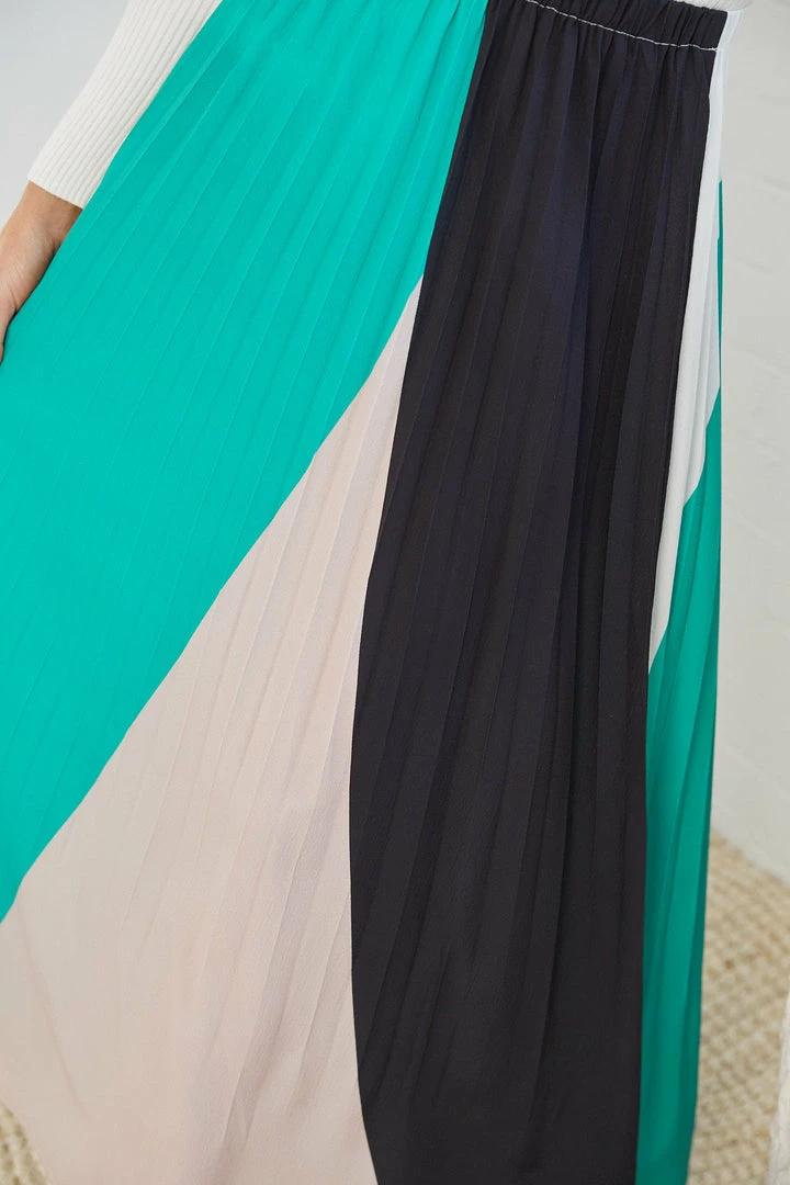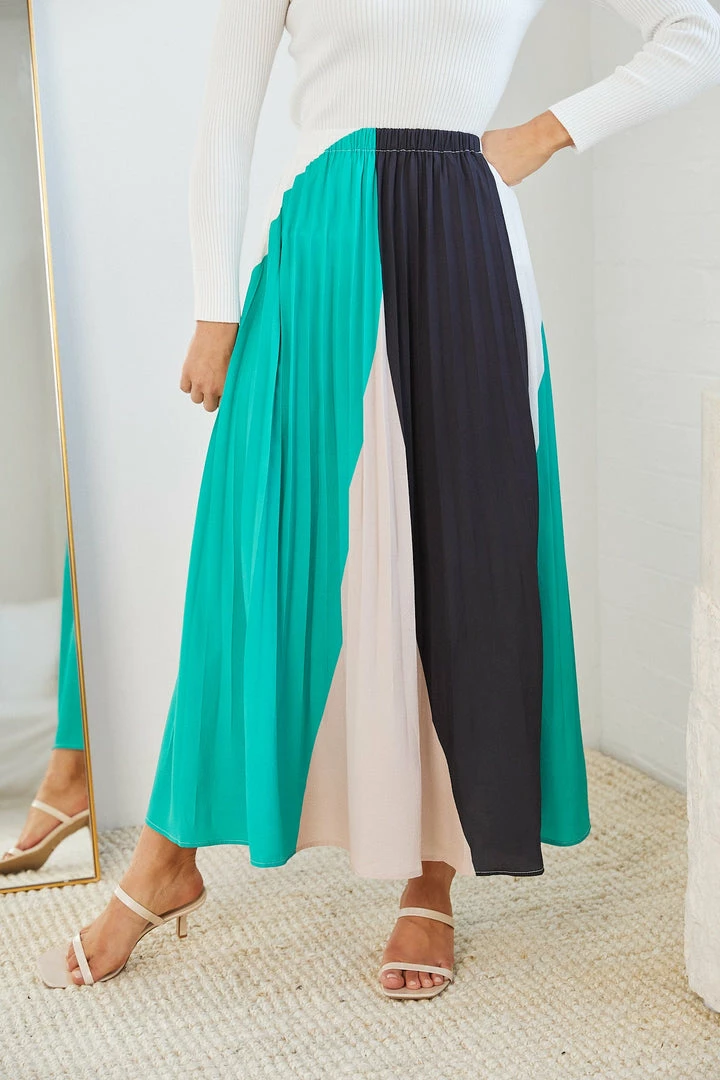 Our Farida Skirt comes in beautiful shades of white, green and black. An art form in its most creative manner, this electric pleated skirt features a slim waistband, maxi length and colour blocking abstractly distributed on the fabric. Add a buckled belt to dress it up and pair with a fitted knit top for a modern 70’s look.