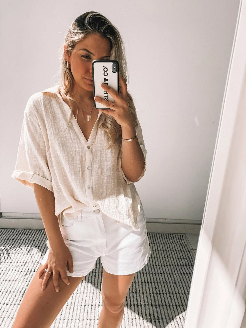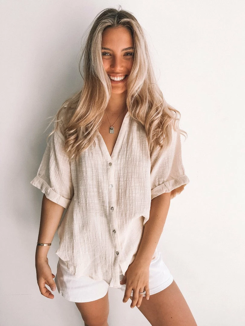 - Key Features: Oversized fit. V neckline. Buttons on front. Maternity friendly. Oversized short sleeves with rolled detailing. High-low hemline.