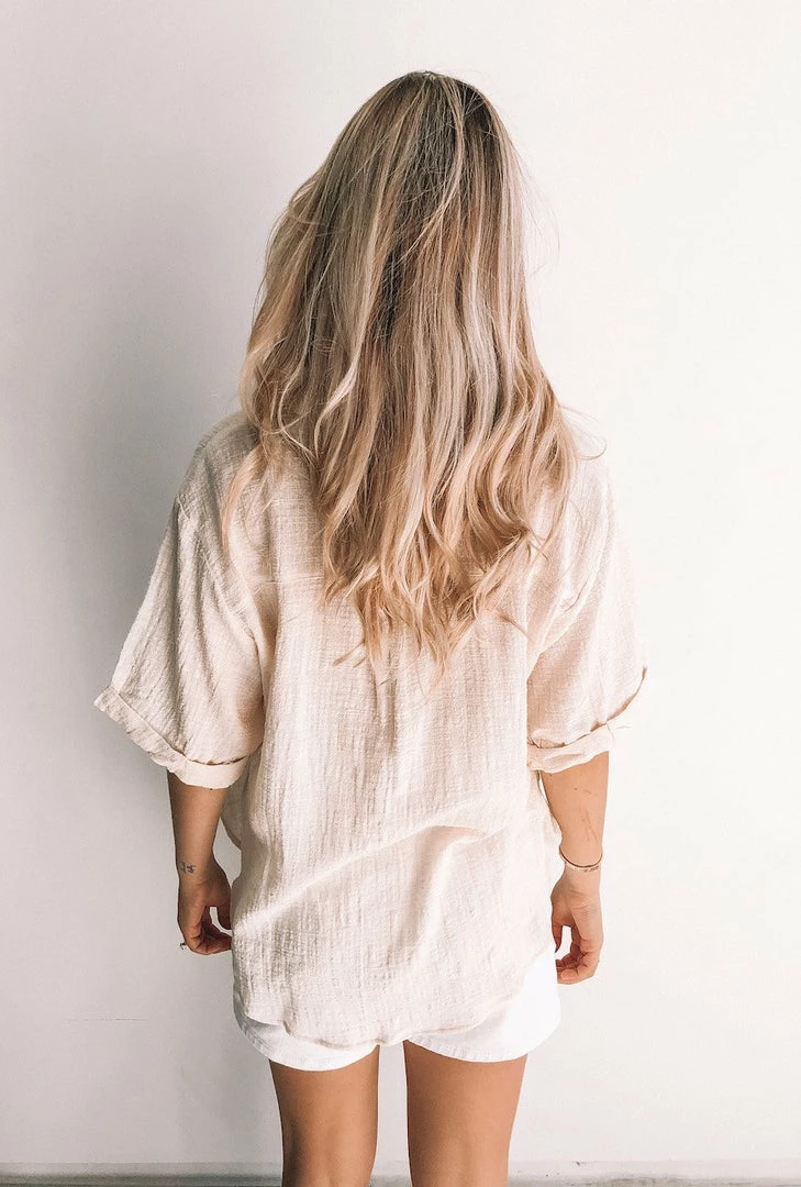 Our Fraise Top is a gorgeous beige tone with blush undertones. It’s a gorgeous medium weight linen material in a relaxed fit that champions breathability and ease. Throw this on as a beach cover, tucked into your fave pair of denim or tied at the front and paired with a pleather skirt. The v neckline and relaxed fit make this ideal for maternity wear and those hot summer days to come.