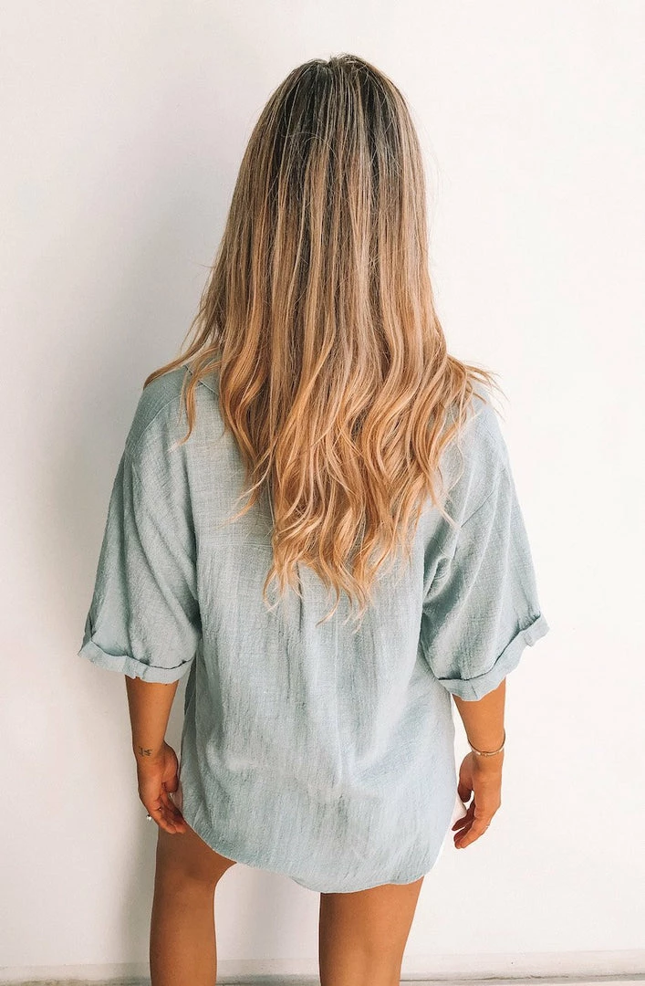 Our Fraise Top is a faded teal with blue-green undertones. It’s a gorgeous medium weight linen material in a relaxed fit that champions breathability and ease. Throw this on as a beach cover, tucked into your fave pair of denim or tied at the front and paired with a pleather skirt. The v neckline and relaxed fit make this ideal for maternity wear and those hot summer days to come.