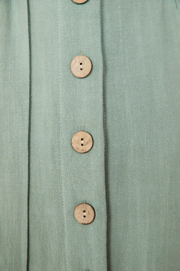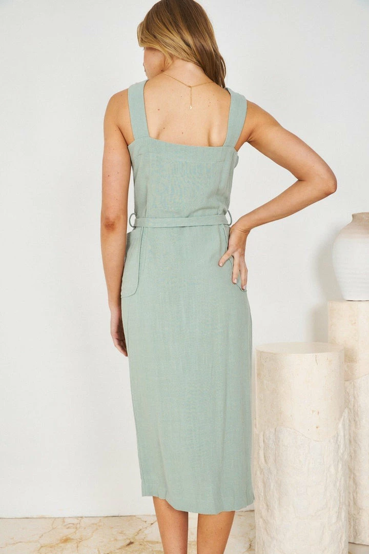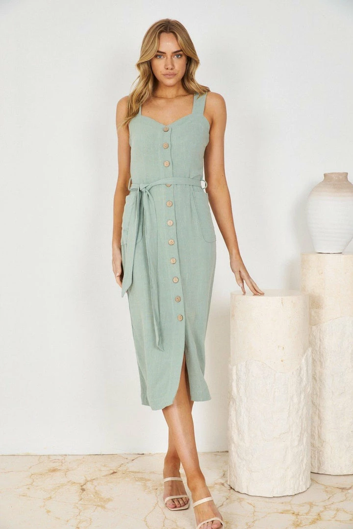 Our Isadora Dress comes in an earthy sage tone with a sweetheart neckline that accentuates the bosom. It features buttons on the front, pockets on the sides, and a matching fabric waist tie to cinch in the figure beautifully. This midi dress is perfect for the warm spring season!