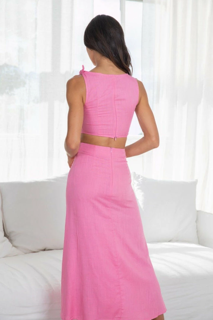 Our Izzy Dress comes in a beautiful pink tone midi. It features a boat neckline, short sleeves with tie detail, and side cutouts at the waist. This flowy midi pairs beautifully with heels or boots for a stunning smart casual look!