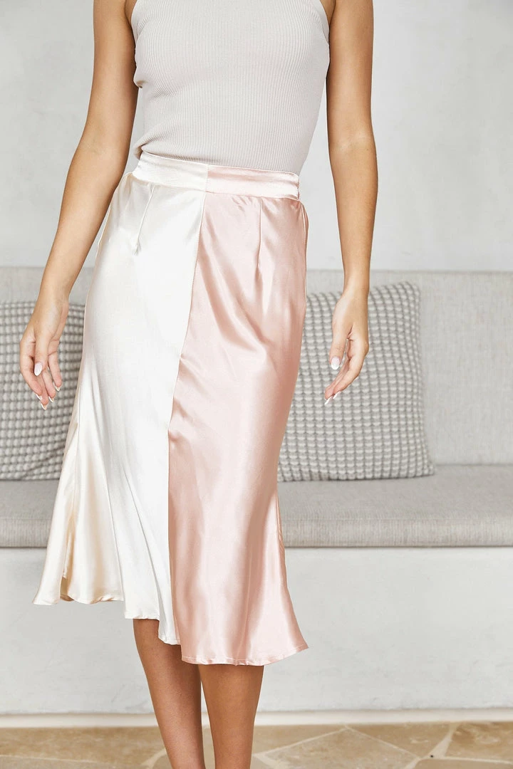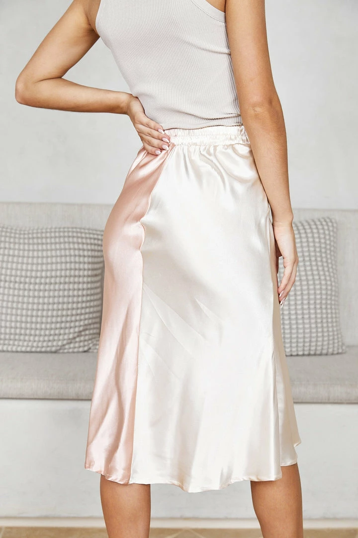 Our Jesenia skirt comes in a shiny blush and champagne tone color. Perfect for any party season – this style has serious wardrobe mileage. Perfectly pair with any basic top and heels, or a statement blouse and boots for added glamour.