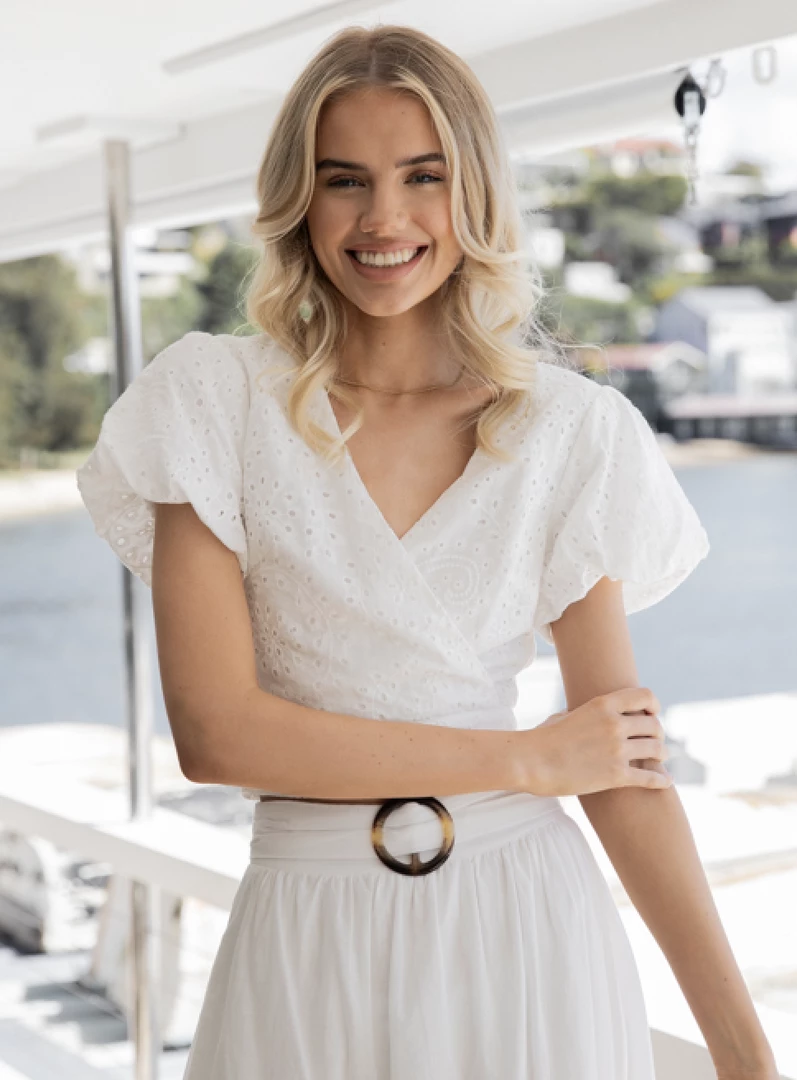 Our Jocelyn Top comes in a fresh white tone. It features a v neckline and short sleeves for a comfortable, relaxed fit. This top pairs beautifully with basic pants or jeans for a fun casual look! Complete the look with our Kenina Skirt!
