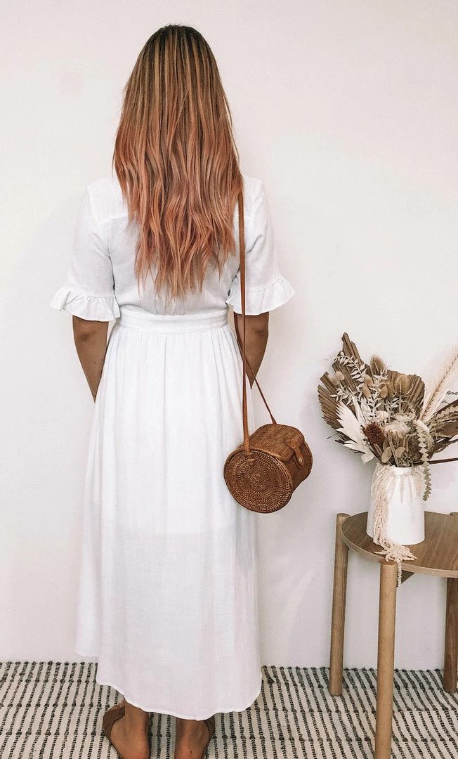 Our Korbela Dress is a fresh white tone. It’s a lovely medium weight linen material in a relaxed and effortless fit, perfect for hot summer days & baby bumps. This breathable number features a v neckline with buttons on front making this not only feminine & flirty but ideal for maternity wear. The midi length is a conservative feature you’re sure to appreciate on windy days. The frill detail on the short sleeves is a cute addition. Pair with your fave strappy sandals and straw bag for a great picnic or beach outfit.
