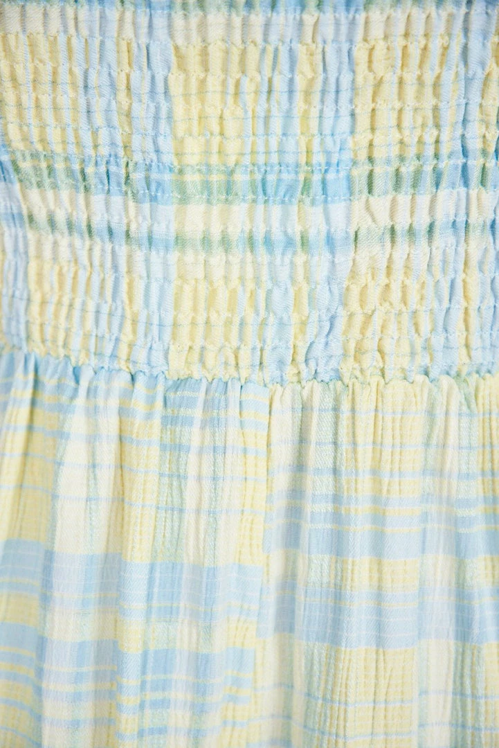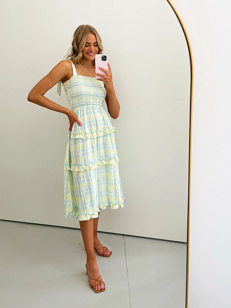 Our London Dress comes in a light yellow tone base, with a light blue tone print. It features a square neckline, adjustable straps, and a layered skirt. This flowy midi pairs beautifully with heels for a stunning look this spring season!
