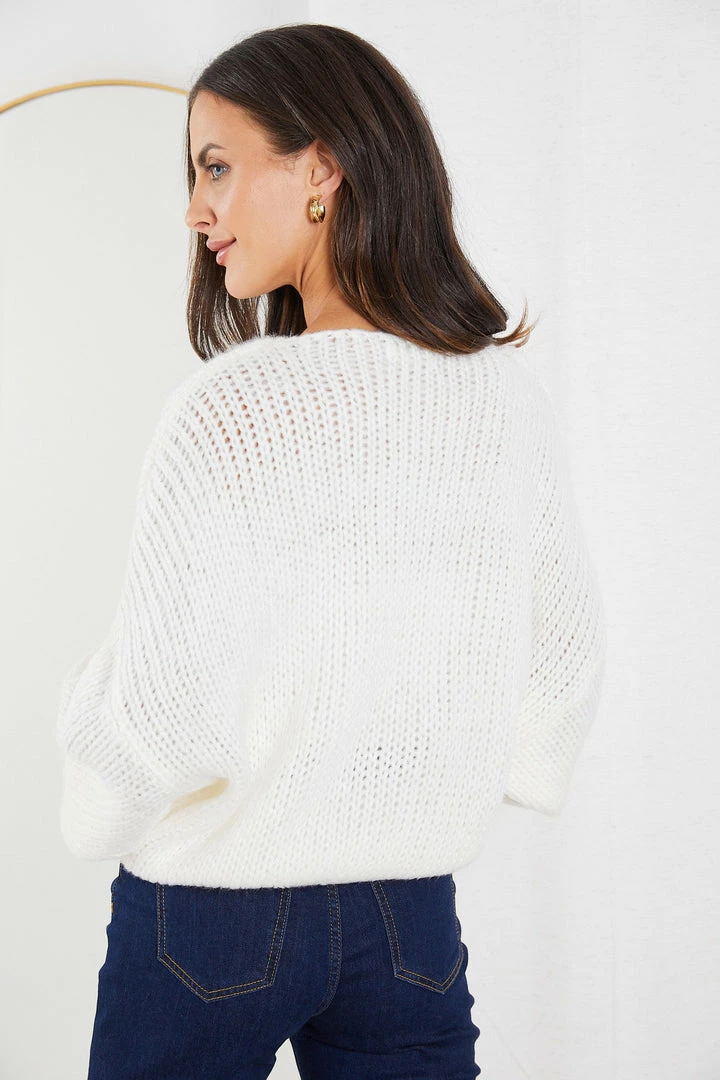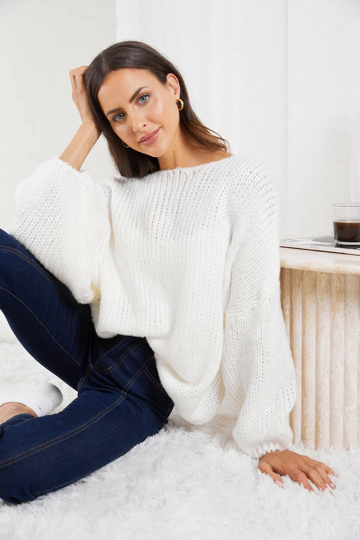 Our Zinny Knit comes in an off-white colour. Fashion meets comfort in this cosy knit top that features a high round neckline and long balloon sleeves for a roomy fit. Pair with leggings for a lazy day outfit or complete the look with our Violeta Jeans – Indigo Wash.