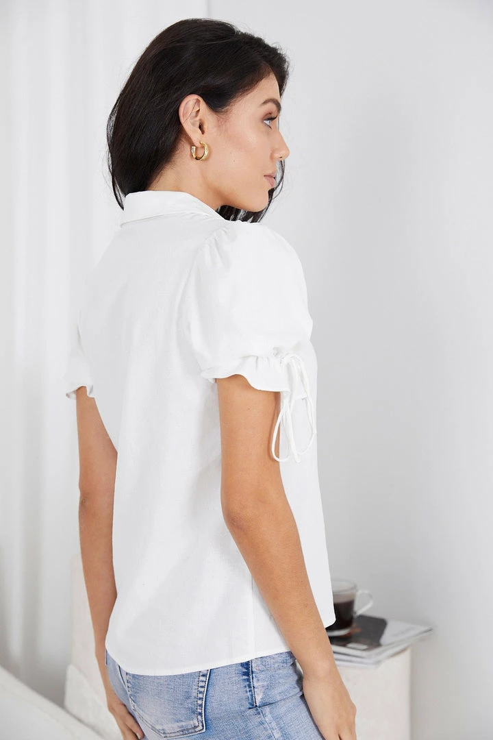 - Key Features: Relaxed fit. V neckline. Traditional collar. Short sleeves with tie details. Collars. Functional buttons down the front.