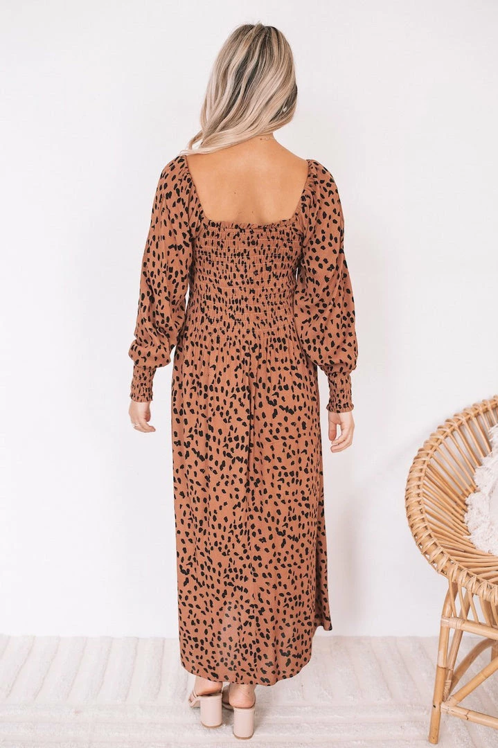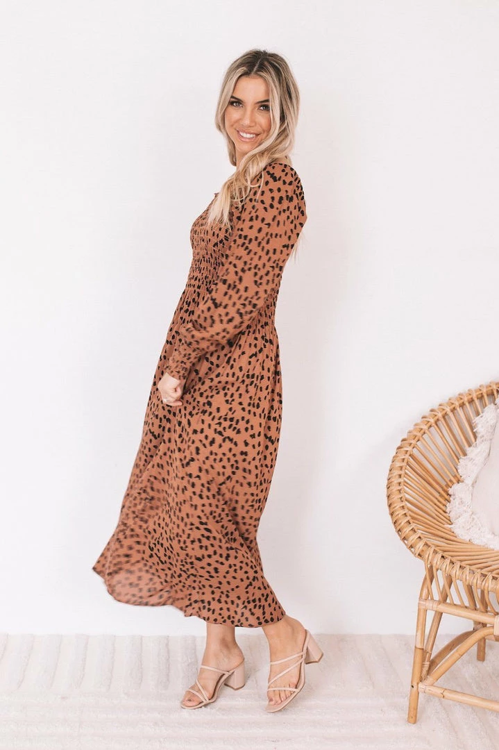 Our Ambra Dress comes in a rust tone base, contrasted with a black tone animal print. It features a sqaure neckline and long bishop sleeves for a relaxed, comfortable fit. Pair with your favourite pair of sandals for an effortless transseasonal look!