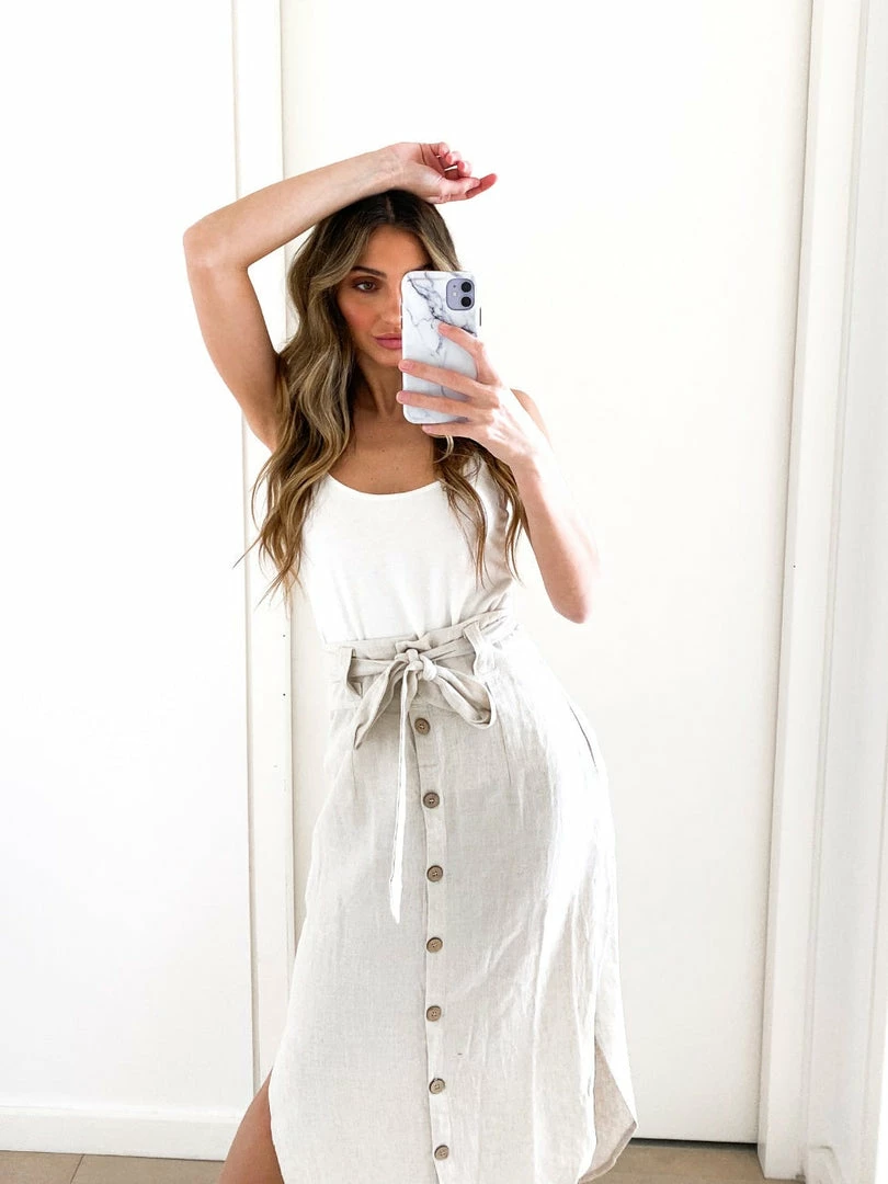 Our Barbara Skirt comes in a classic neutral beige tone. It features pockets on the front sides, belt loops at the waist, buttons down the front to close and a fabric waist tie. This skirt pairs beautifully with a basic top for a cute casual look!