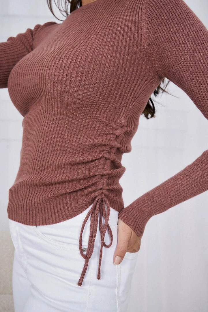 Our Davina Top is a gorgeous rose pink tone. It features a high round neckline, long fitted sleeves, and a contrasting rib knit pattern all over the garment. This versatile top is perfect for both casual outings, and taking on the day at the office!
