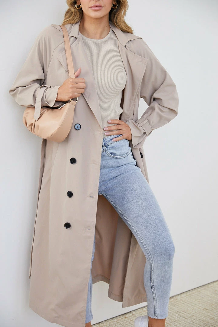 Our Persis Trench Coat comes in an elegant mocha colour. Suit up for a stylish journey in this long chic coat that features a napoleon collar & wide lapel, storm flap, functional buttons, long sleeves with buckled cuff belts, tea length hem and fabric waist belt. This versatile staple can be worn as a one piece or as an outerwear over a white shirt and leggings!