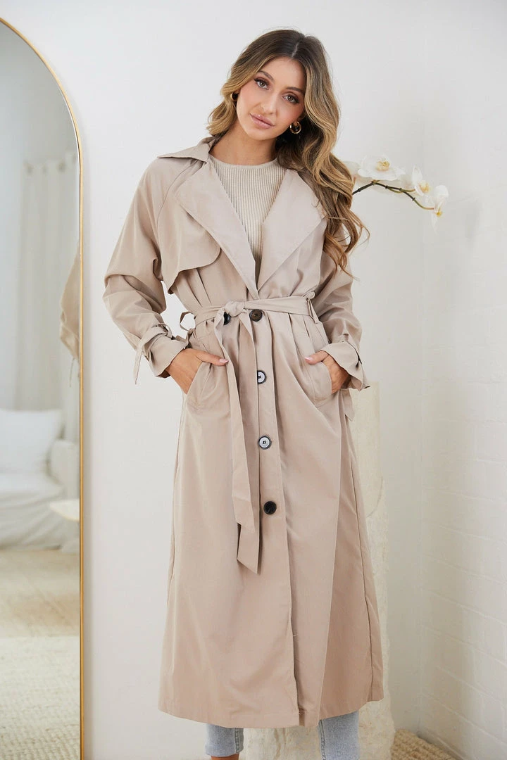 - Key Features: Napoleon collar & wide lapel. Storm flap. Functional buttons. Long sleeves with buckled belt. Fabric waist tie. Tea length hem.