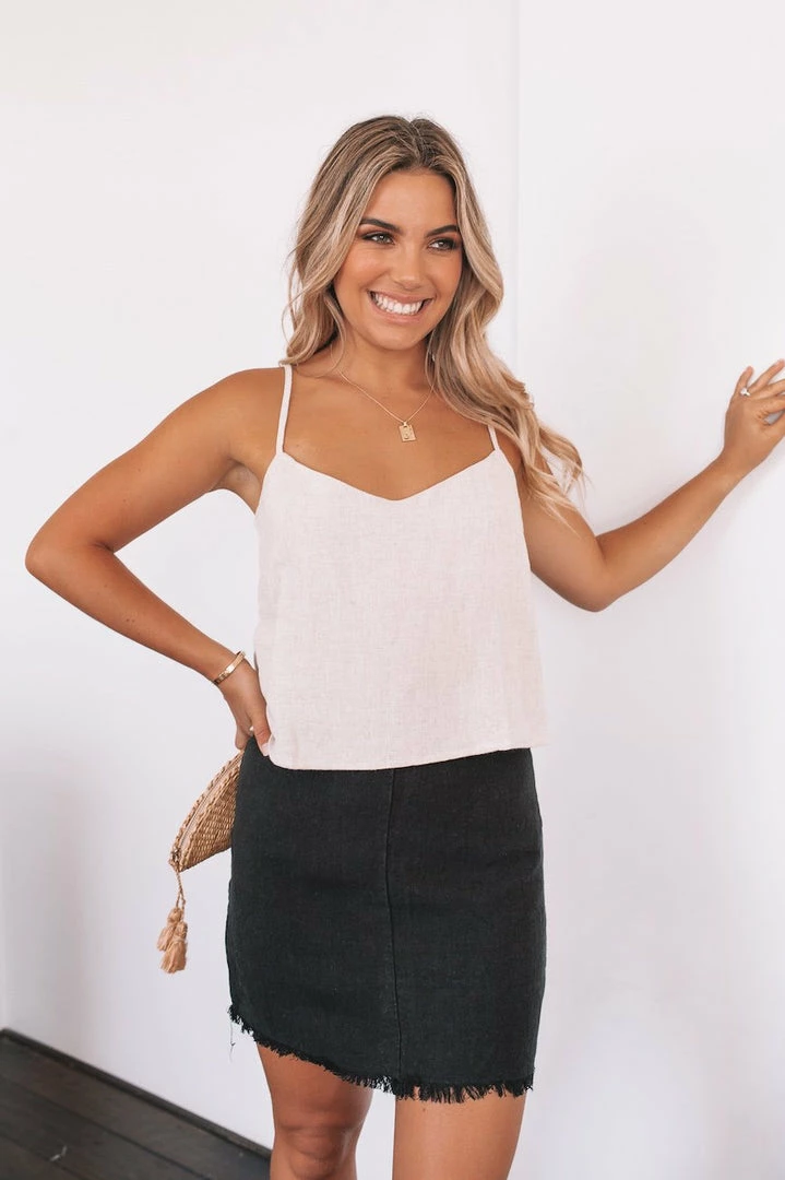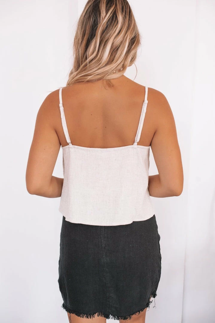 - Key Features: Slightly cropped length. Relaxed fit. Soft V neckline. Adjustable spaghetti straps.