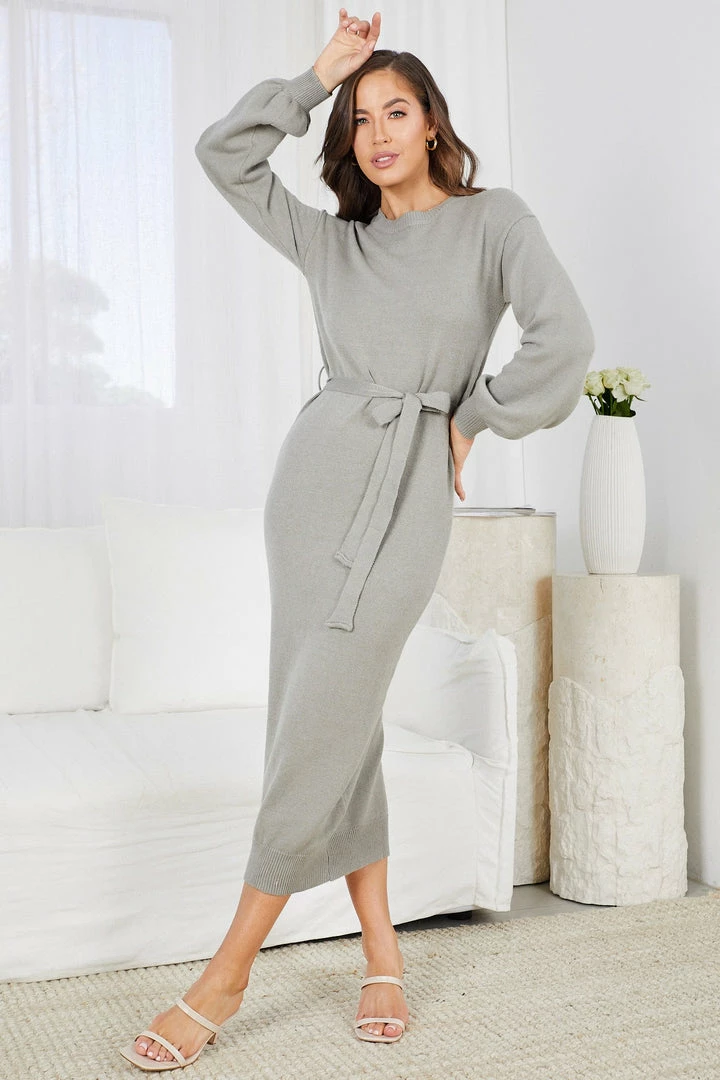 Our Saltee Knit Dress comes in a posh khaki colour. A seamless transition from workplace to fine dining, this knit dress is a versatile piece your wardrobe would thank you for! It features a ribbed round neckline and hem securing the fabric to your body, long bishop sleeves and a fabric belt that pairs beautifully with gold accessories.
