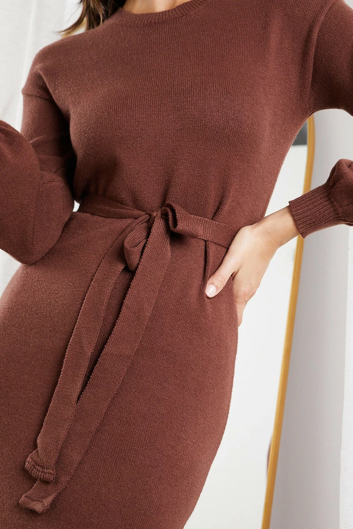 Our Saltee Knit Dress comes in a posh rust colour. A seamless transition from workplace to fine dining, this knit dress is a versatile piece your wardrobe would thank you for! It features a ribbed round neckline and hem securing the fabric to your body, long bishop sleeves and a fabric belt that pairs beautifully with gold accessories.