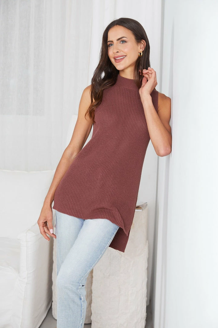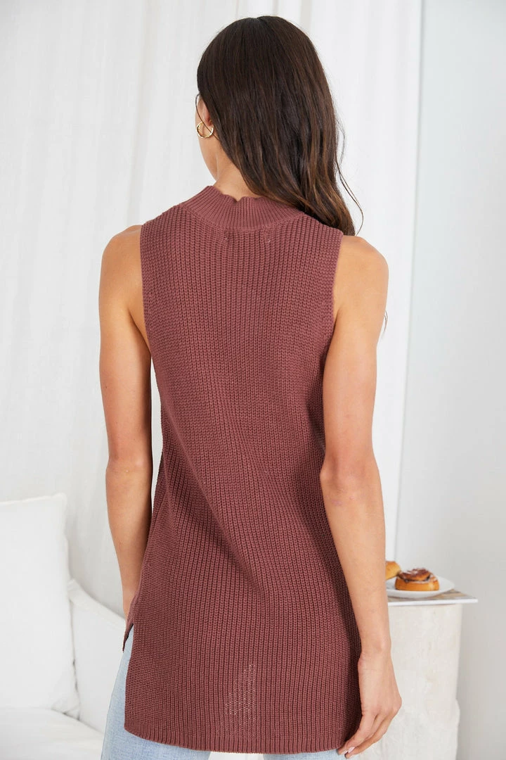 Our Finnah Top comes in a rose colour. It is a sleeveless classic piece that features a high collar, knit detailing, and stretchy fabric for a comfortable fit. This basic top would pair well with pieces from your wardbrobe from pants to skirts and can be layered with a vest and gold jewelry for an elegant finish.