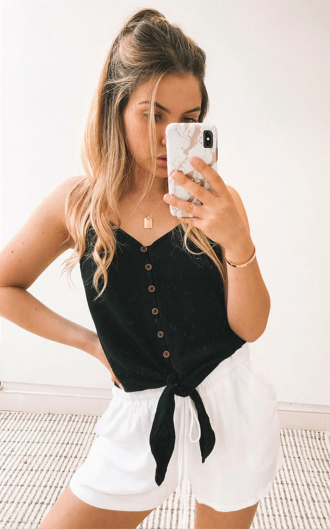 Our Lulled Top is a classic black tone. This lightweight relaxed fit singlet is a lovely basic that is spacious and practical. The buttons on front make this ideal for breast feeding, whilst the tie on front is a cute addition to this top.