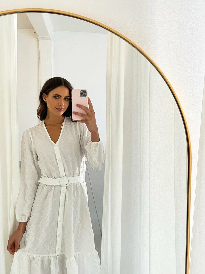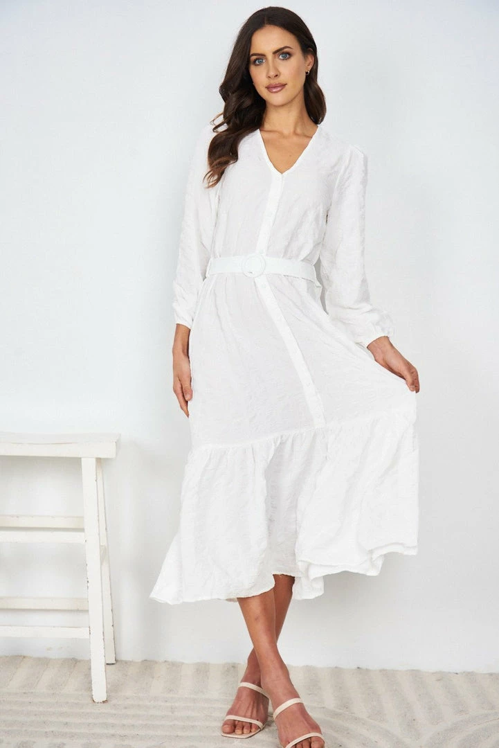 Our Tamela Dress comes in a crisp white tone. It features a v neckline, long bishop sleeves, and a fabric belt to cinch in the figure beautifully. This stunning midi pairs beautifully with heels for a stunning casual look!