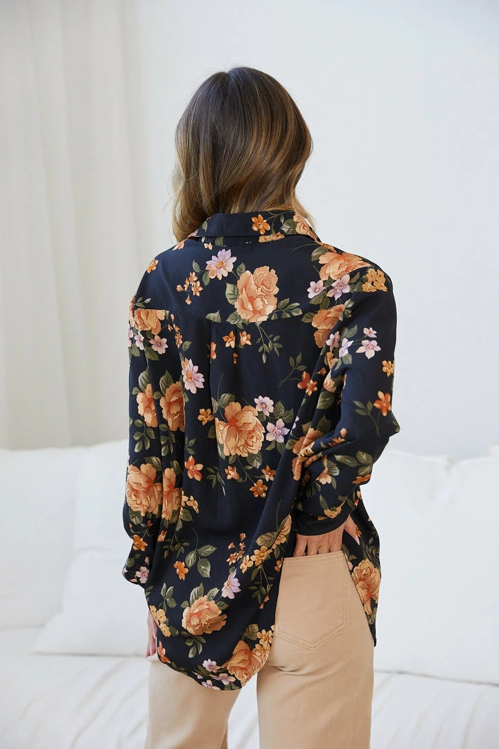 Our Daliya Shirt comes in a nice black base with multicoloured floral prints. A fashionable office dress code, this long sleeved top is not your normal corporate outfit as it comes with beautiful patterns, classic collar, centre-front buttons and bust pocket. A knee length camel tone skirt and nude heels will make you a stunning lady boss!