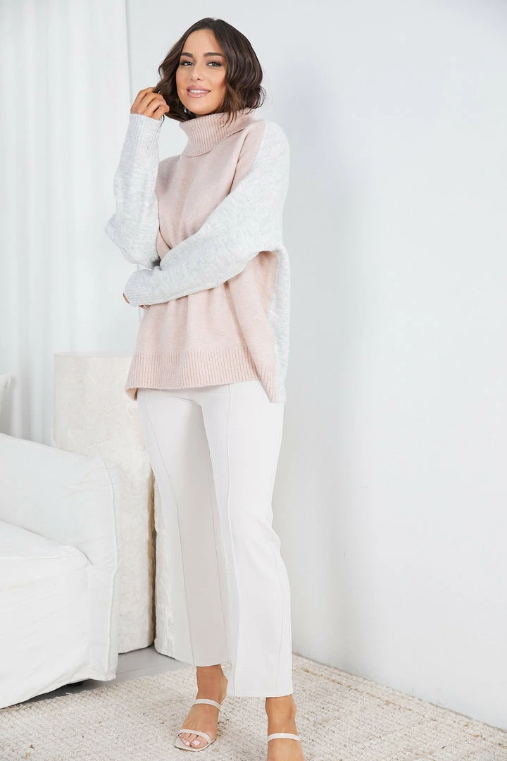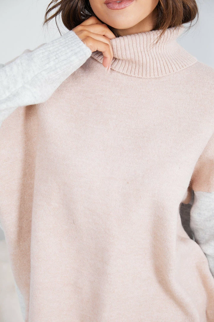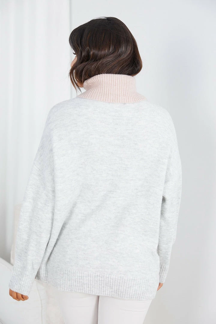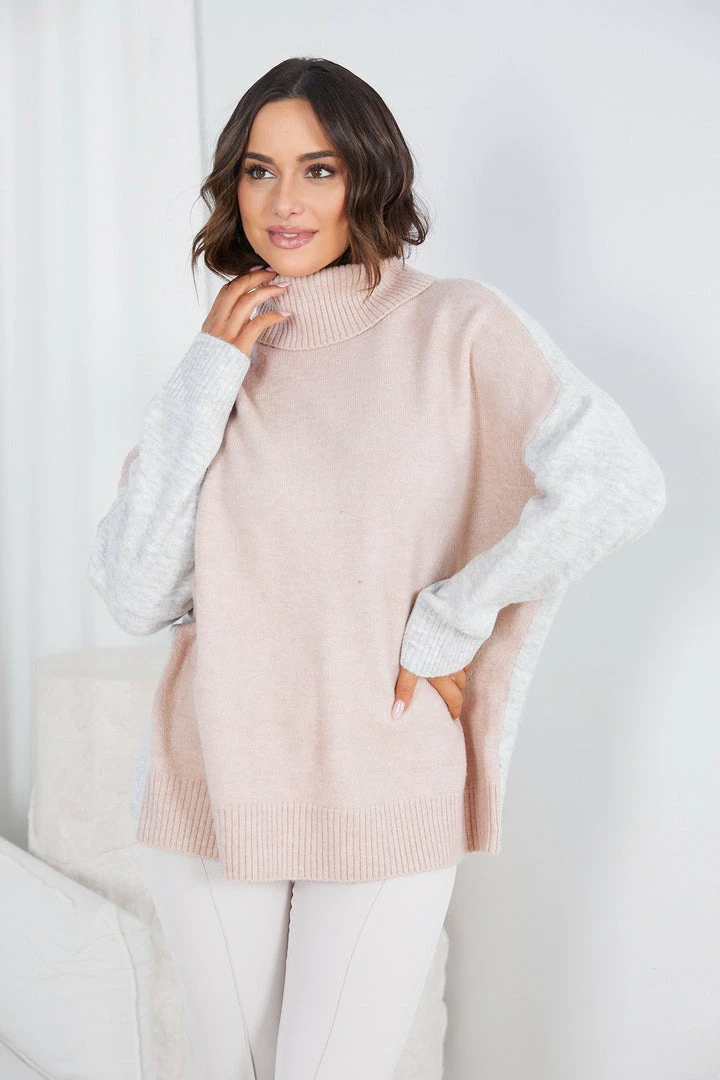 Our Estatia Knit comes in a beautiful colour blocking in the shades of blush and grey. So cosy you wouldn’t want to take it off, this jumper features a turtleneck, long drop sleeves and contrasting hues for a stylish drama. Pair it with a leather mini skirt and stockings and be the talk of the town!
