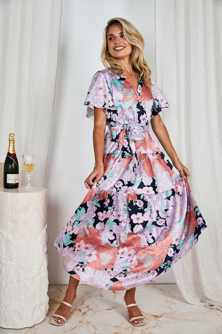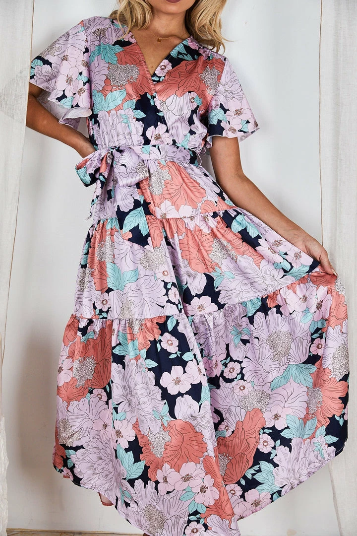 Our Given Dress comes in an orange, pink, & light blue tone floral print. This relaxed fit midi features a layered high low hemline and wrap-like bust with an elastic waist and fabric waist tie to beautifully cinch in the figure. The butterfly short sleeves and relaxed fit make this ideal for maternity wear and provide ultimate comfort whilst looking your best.