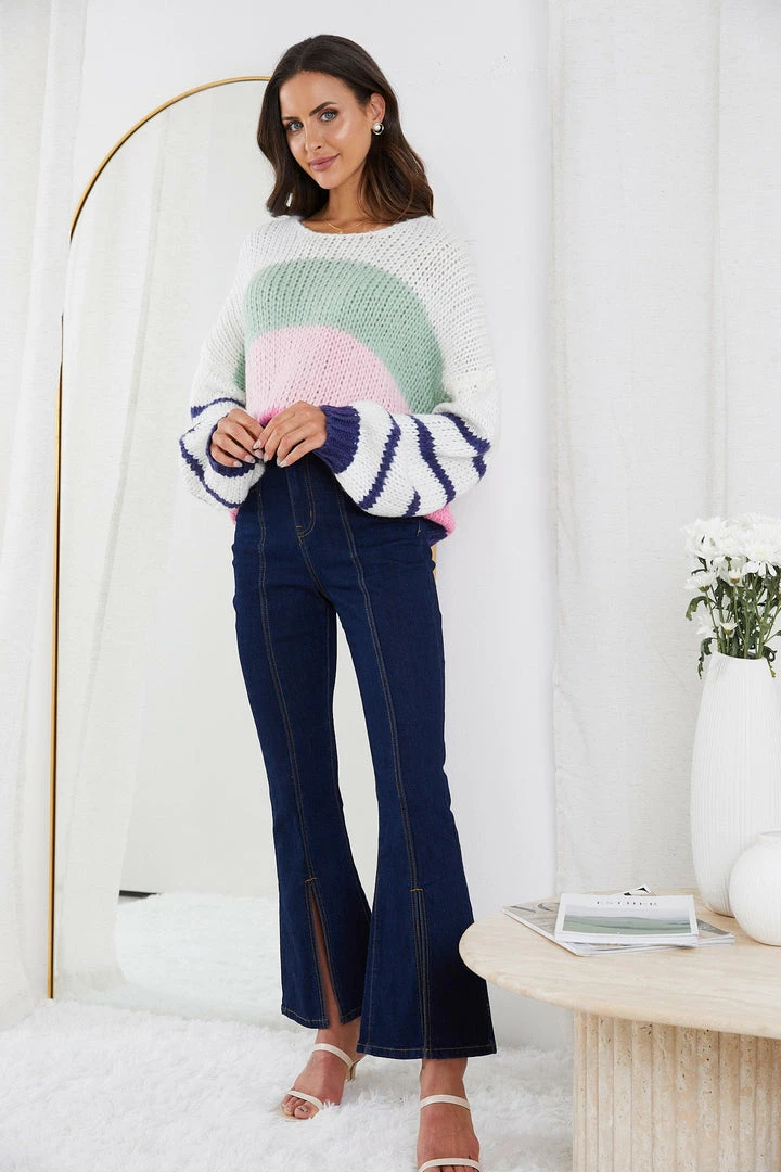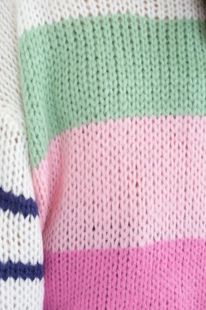 Our Mirabella Knit comes in a white, sage, blush & pink block stripe. It features a scoop neckline and long relaxed sleeves for a comfortable fit. This fun knit is the perfect casual piece for cold winter outings!