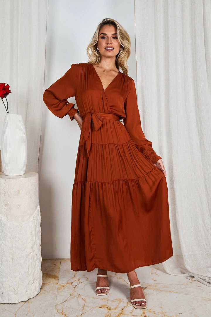 Our Sienna Dress comes in an orange rust tone. It features a v neckline, long bishop sleeves, a tiered skirt, and a fabric waist tie to cinch in the figure beautifully. This flowy midi pairs wonderfully with heels for a stunning formal look!