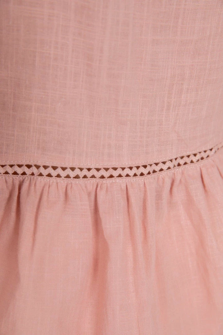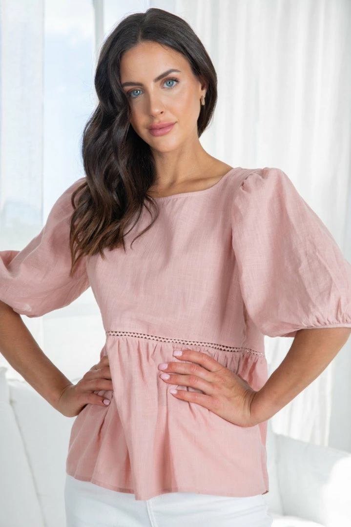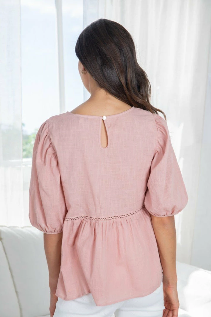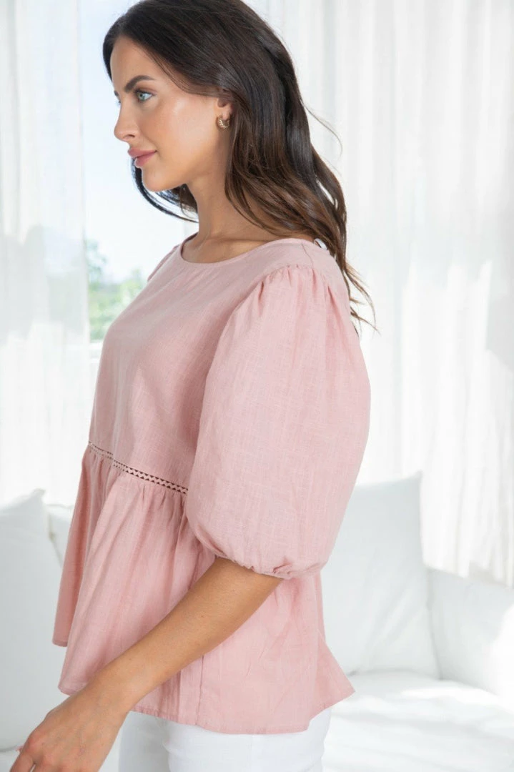 - Key Features: 3/4 balloon sleeves with cinched cuffs. Relaxed fit. Round neckline. Frill hemline. Micro crochet detailing on waist. Bump friendly
