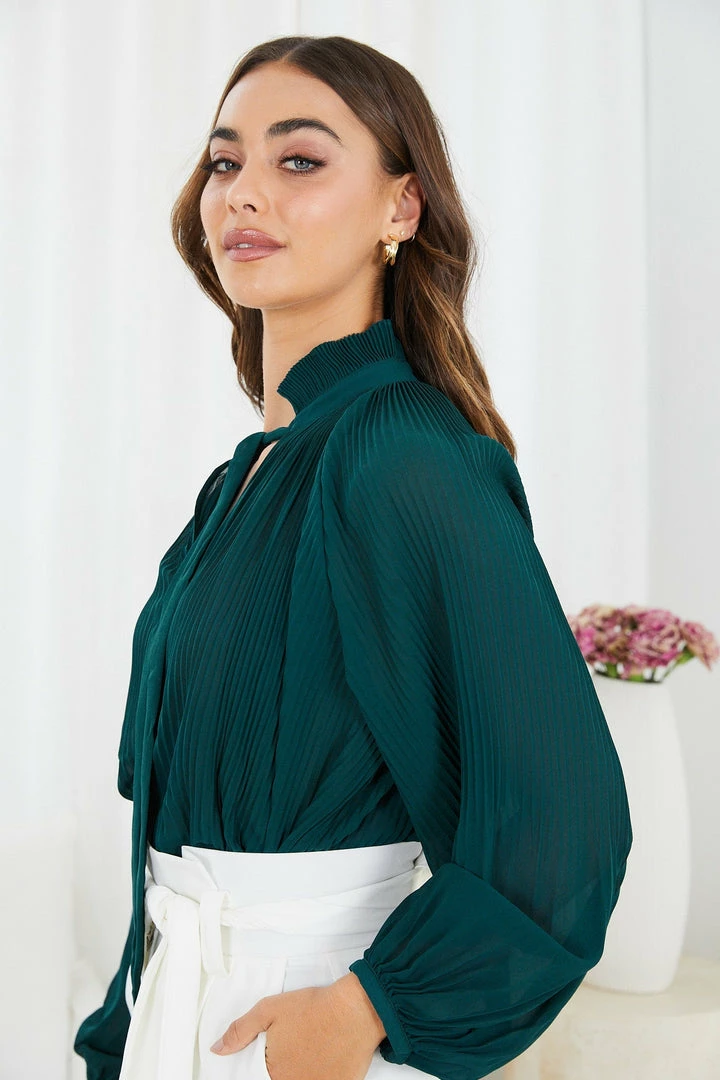 Our Zipporah Blouse comes in a classy green colour. Too glam perfect for the gram, this top features a high ruffled collar with a versatile tie you can style in different ways, long bishop sleeves and flowy semi-transparent fabric for a touch of reveal. Pair it with heels for a refined look.
